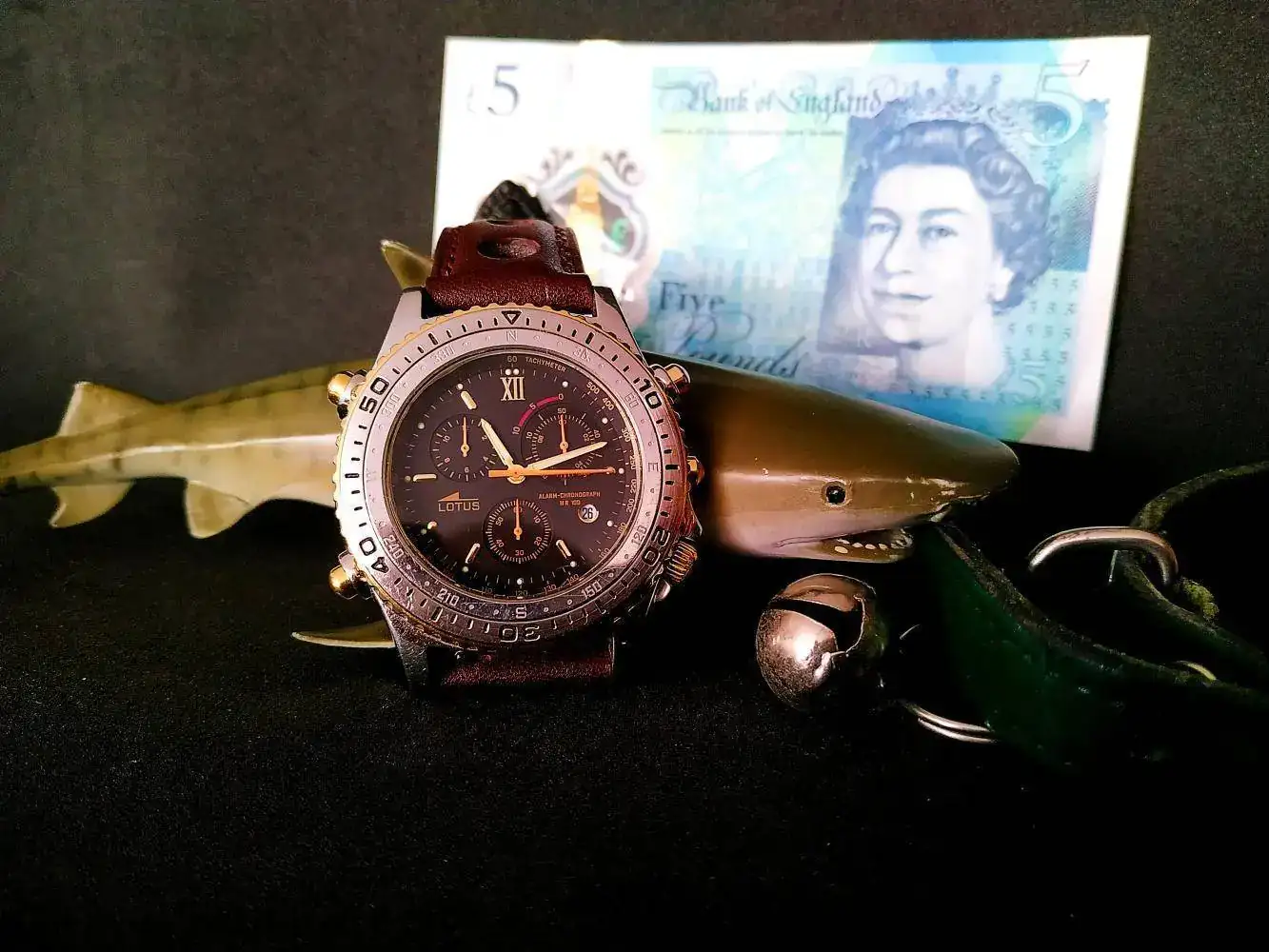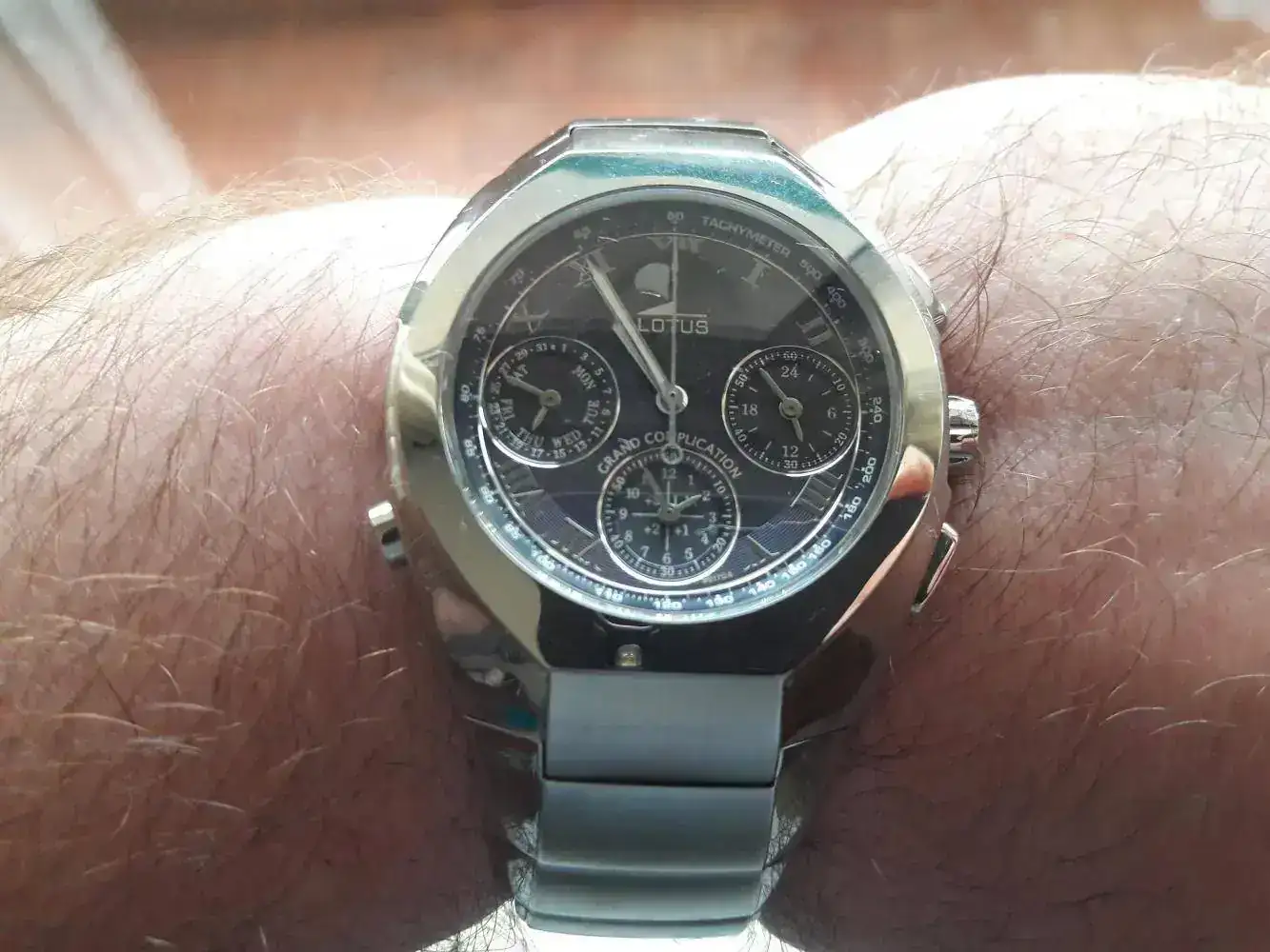 Este es mi Lotus Titanium, lo tengo hace 23 años. Sigue perfecto de precisión y todas sus funciones al 100%. Visualmente es muy llamativo, por su combinación de titanio y dorado, y el peso es mínimo, una gozada llevarlo.