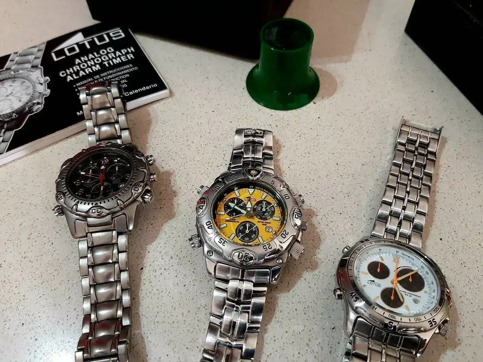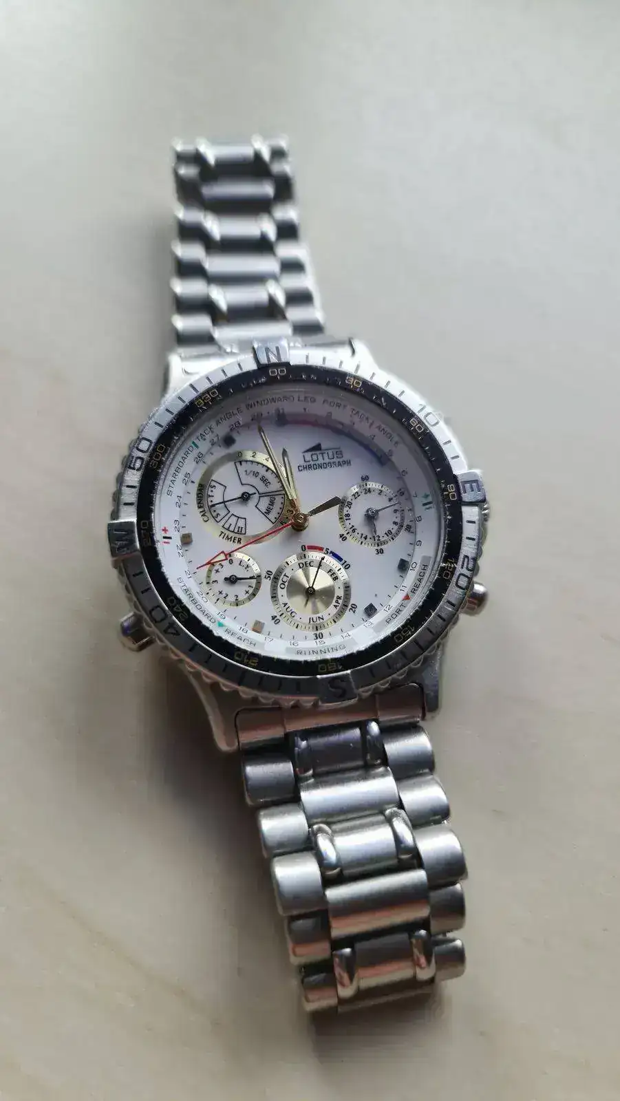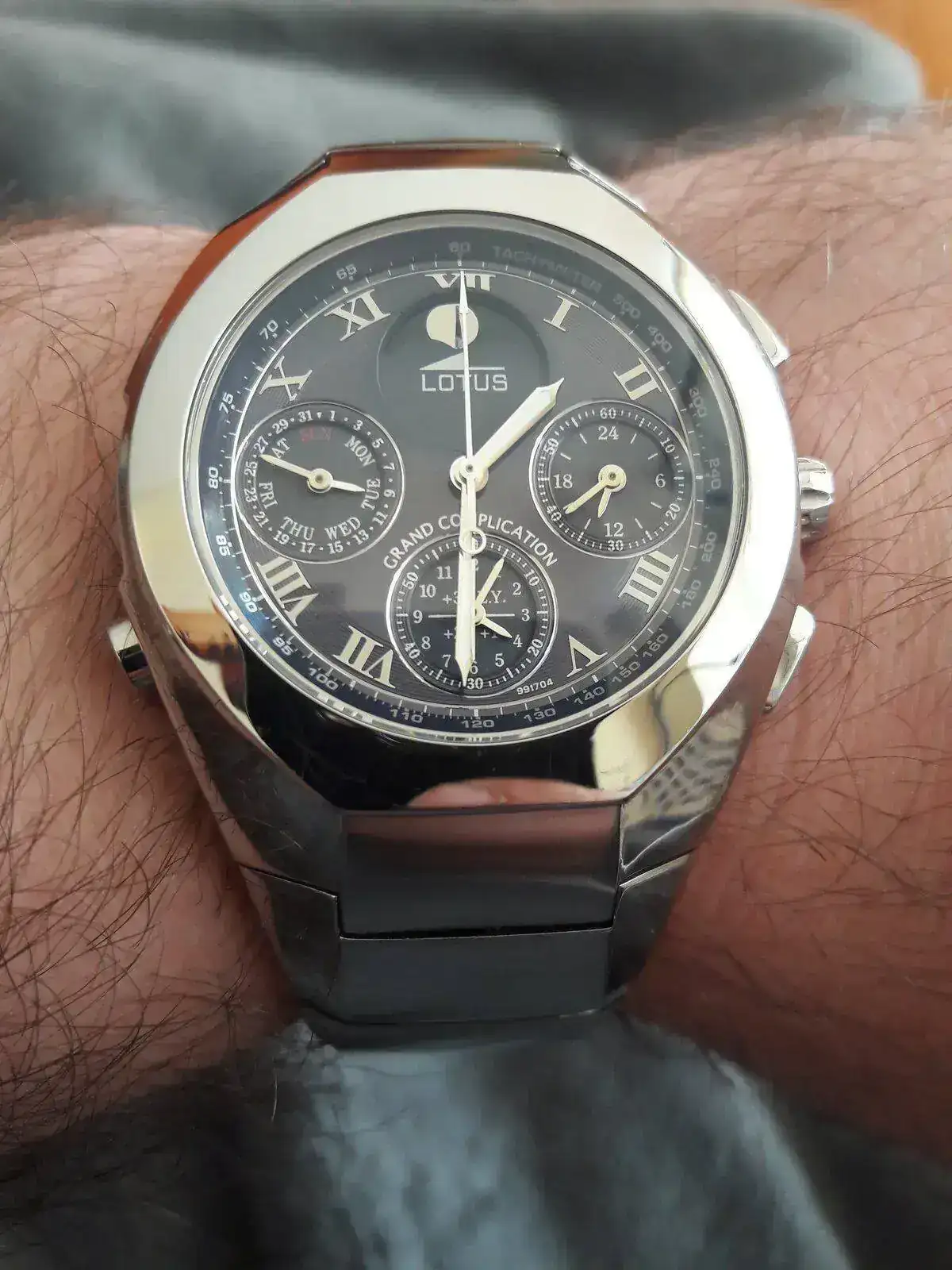 Muy fotogénico, me gusta mucho.Ya he estrenado mi "nuevo" Lotus, un 15180 calibre Miyota OS80. El reloj tiene unos años pero está en un estado excelente. Nunca había tenido un Miyota OS80 y me ha gustado mucho este calibre, de hecho ha sido buscando el OS80 como me topé con este Lotus. No es lógicamente de la categoría del Miyota 3S10, pero es un calibre completo, con un crono de 12 horas y una alarma muy útil. Uso mucho las alarmas de mis relojes, y la de este me gusta mucho cómo está concebida y cómo se usa. El cronógrafo ya lo he usado para una cuenta de dos horas y es muy completo y legible. Además el reloj es un wr. 100m y tiene bisel giratorio, muy bien centrado por cierto. La esfera es de un gris con efecto rayos de sol muy elegante y muy elaborada, con apliques facetados para las horas y subesferas más oscuras con marco plateado y con su propia textura y su propio efecto rayos de sol. Las dos agujas extra del sistema de alarma me encantan. Una sorpresa ha sido que la alarma tiene función despertador, se repite cada 2 minutos y 45 segundos mientras no se desconecte, otra utilidad más que me gusta mucho.