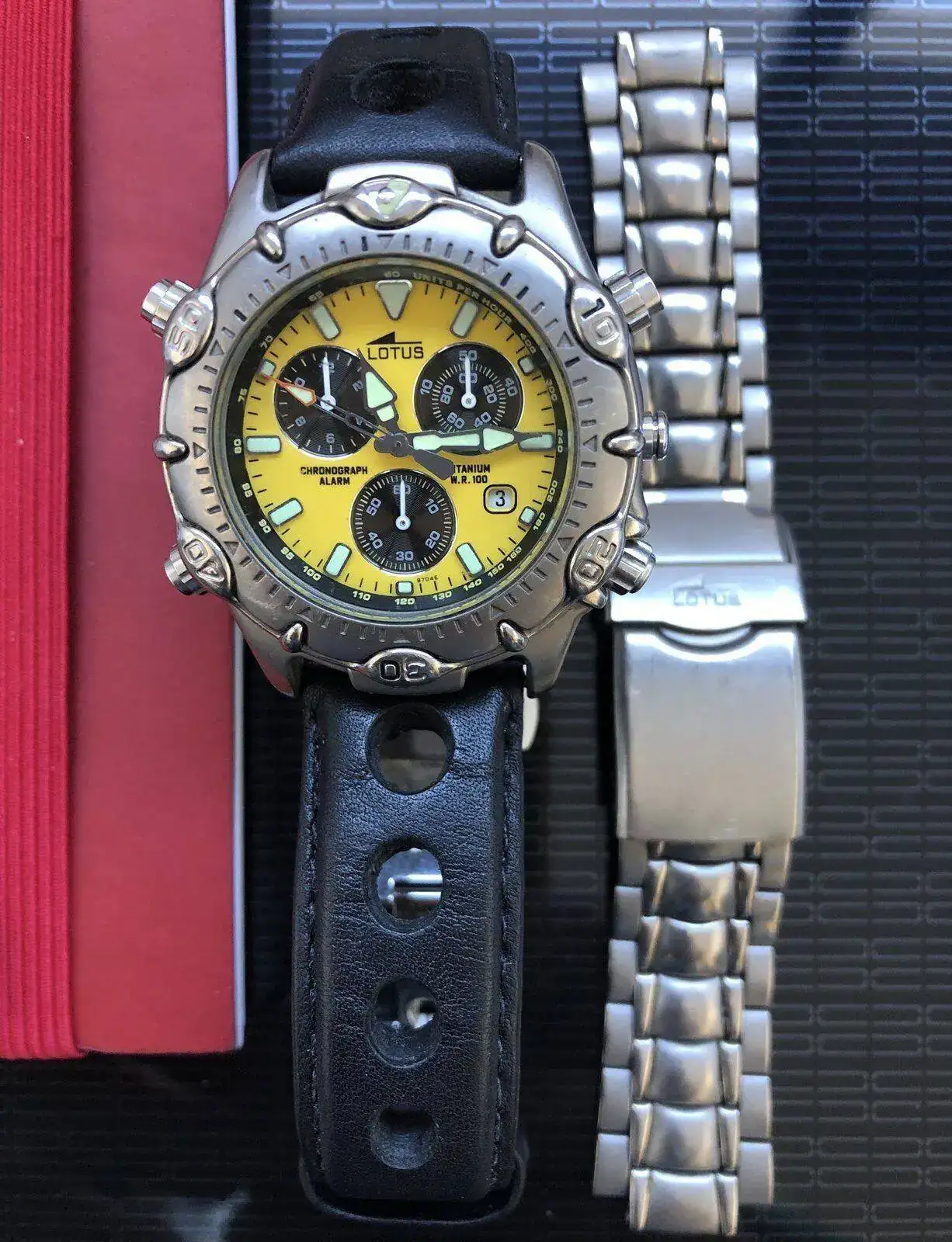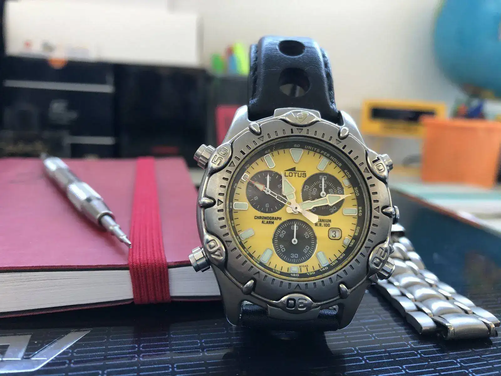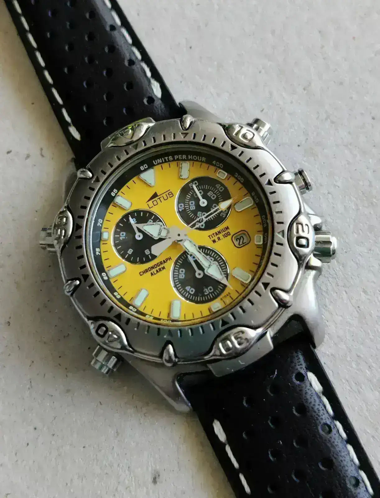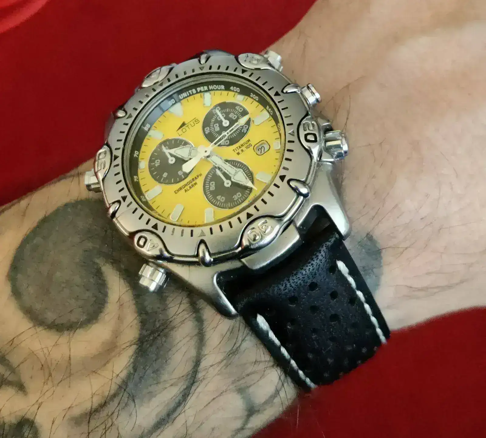 Muy fotogénico, me gusta mucho.Ya he estrenado mi "nuevo" Lotus, un 15180 calibre Miyota OS80. El reloj tiene unos años pero está en un estado excelente. Nunca había tenido un Miyota OS80 y me ha gustado mucho este calibre, de hecho ha sido buscando el OS80 como me topé con este Lotus. No es lógicamente de la categoría del Miyota 3S10, pero es un calibre completo, con un crono de 12 horas y una alarma muy útil. Uso mucho las alarmas de mis relojes, y la de este me gusta mucho cómo está concebida y cómo se usa. El cronógrafo ya lo he usado para una cuenta de dos horas y es muy completo y legible. Además el reloj es un wr. 100m y tiene bisel giratorio, muy bien centrado por cierto. La esfera es de un gris con efecto rayos de sol muy elegante y muy elaborada, con apliques facetados para las horas y subesferas más oscuras con marco plateado y con su propia textura y su propio efecto rayos de sol. Las dos agujas extra del sistema de alarma me encantan. Una sorpresa ha sido que la alarma tiene función despertador, se repite cada 2 minutos y 45 segundos mientras no se desconecte, otra utilidad más que me gusta mucho.