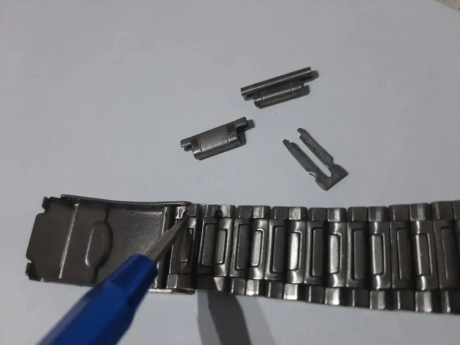 Muchas gracias, pues no me habia fijado y mira que le he dado vueltas jejejeje. Mañana lo pruebo!Hola tolkien84, si te fijas, en los últimos eslabones hay una pequeña flecha grabada, pues bien, simplemente has de hacer empuje con un destornillador pequeño o cualquier otra herramienta y extraer el pasador. Te adjunto una foto para que veas por donde has de proceder.