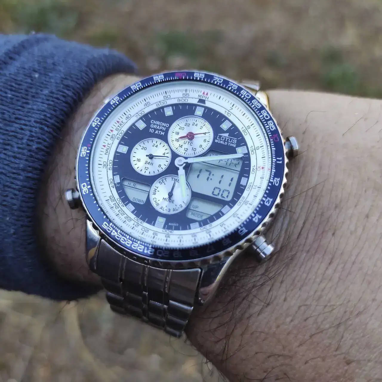 Muy bonito el Lotus, creo que se le suele llamar "World Time" por lo que pone en la esfera, a mí me gusta llamarle C-300. Siempre me han gustado el estilo y las funciones del Citizen C-300 y C-320, y del Lotus que es igual. Algunas veces he estado tentado de comprar uno, pero también a veces he leído comentarios sobre falta de fiabilidad en algunas unidades con años. Aunque vete tú a saber, si han sido maltratados es lógico que algunos tengan averías, como les pasa a los Miyota 3S10 y otros relojes de su época por buenos que sean.Pues esta semana... por lo que sea... está siendo una "Lotus week". O tal vez será porque son relojes que puedes tener 10, 20,30 años sin que en ningún momento estés aburrido de ellos (y esto, a veces, pasa...). Compartiendo motor con el Promaster C300 de Citizen...
