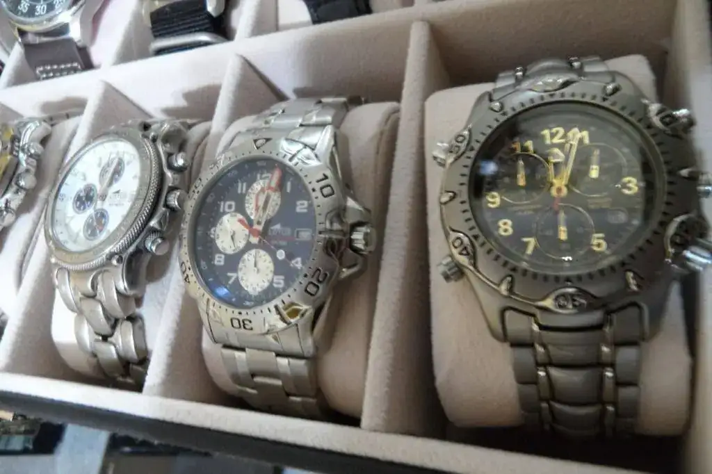 Y luego me cayeron regalados el de esfera azul al que cambié las agujas, el de esfera blanca tipo daytona y el último que rescaté de la basura, le puse una pila y clava la hora el maldito...