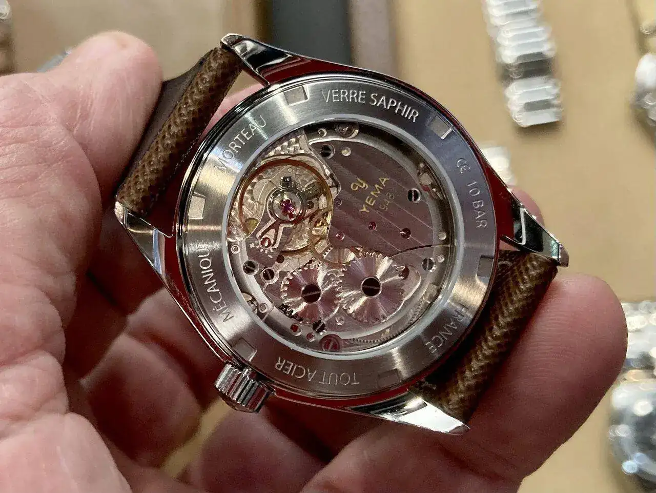 Me dijeron que tienen dos calibres, ambos propios: uno manual cuyas piezas se fabrican en China pero se montan en sus instalaciones de Morteau (Francia) y otro con micro-rotor hecho totalmente en Suiza