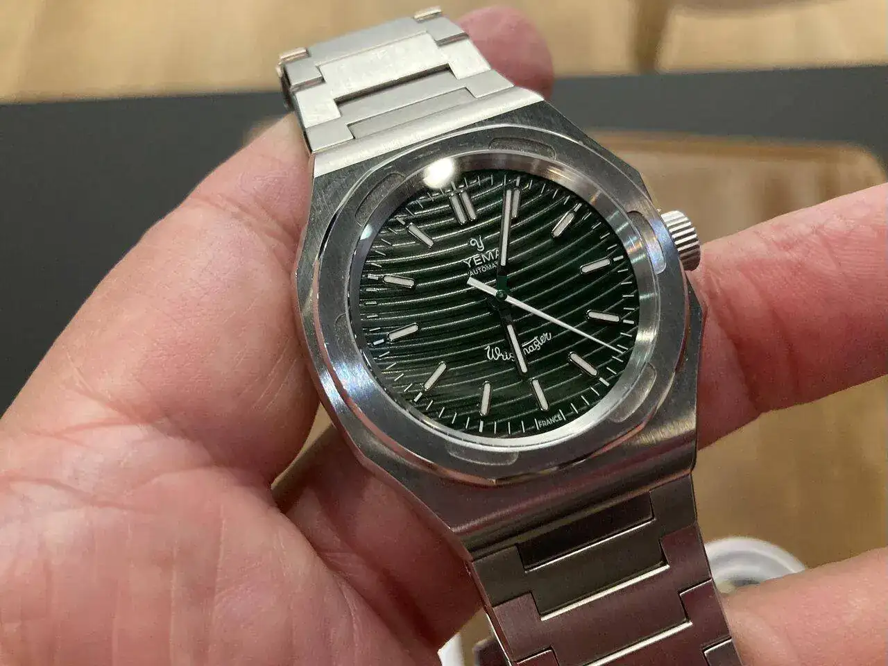La decoración (color verde aquí) se hace por deposición atómica, con un resultado mucho más fino que el DLC, y ya no digamos el PVD.