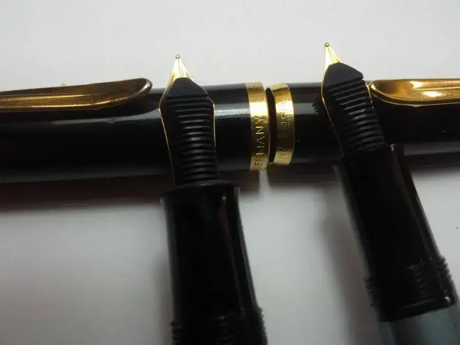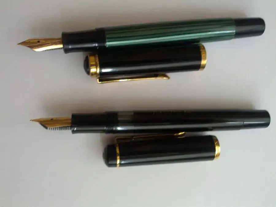 En Cuanto a la negra es una Pelikan 150 (creo) ya fuera de producción y con un plumín de acero dorado, . Buena estilográfica bolsillera y que escribe de lujo. 1 saludo.