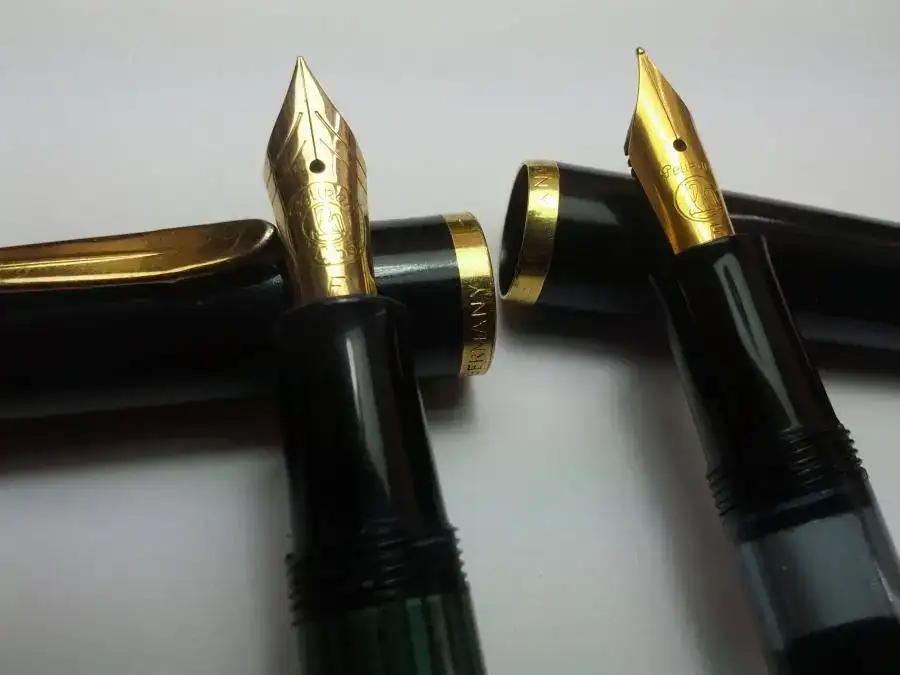 Por el alimentador del plumín diría que la verde es una M400, y la negra, si tiene plumín chapado, es una M150. Las dos ochenteras.