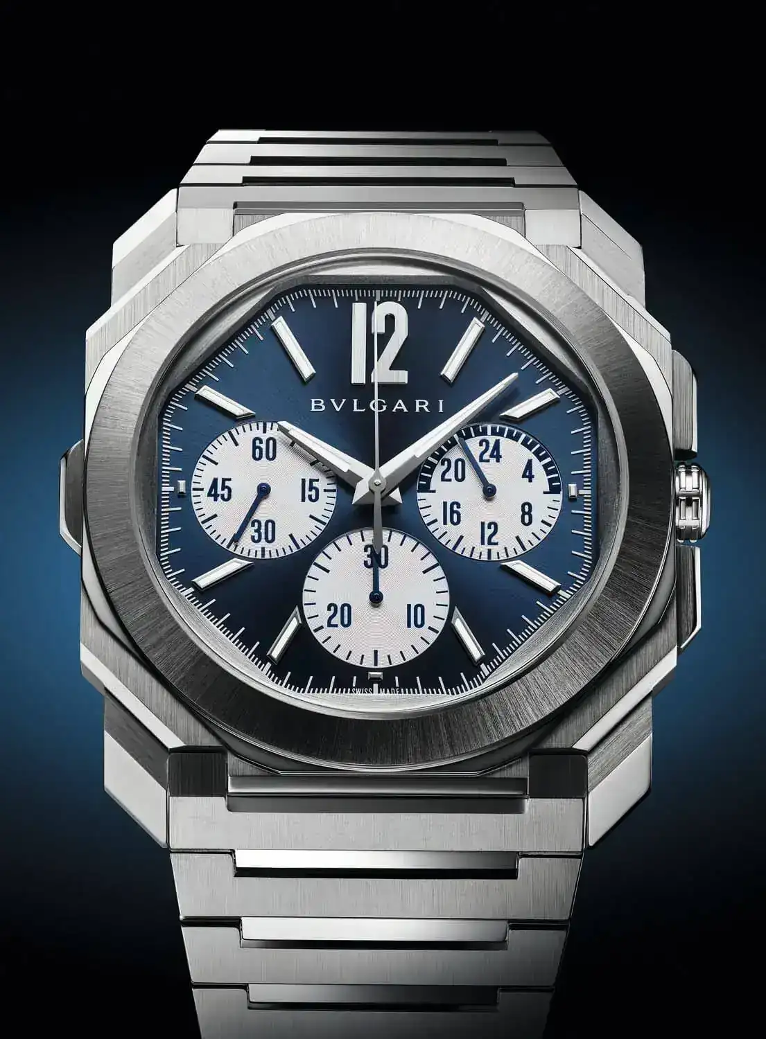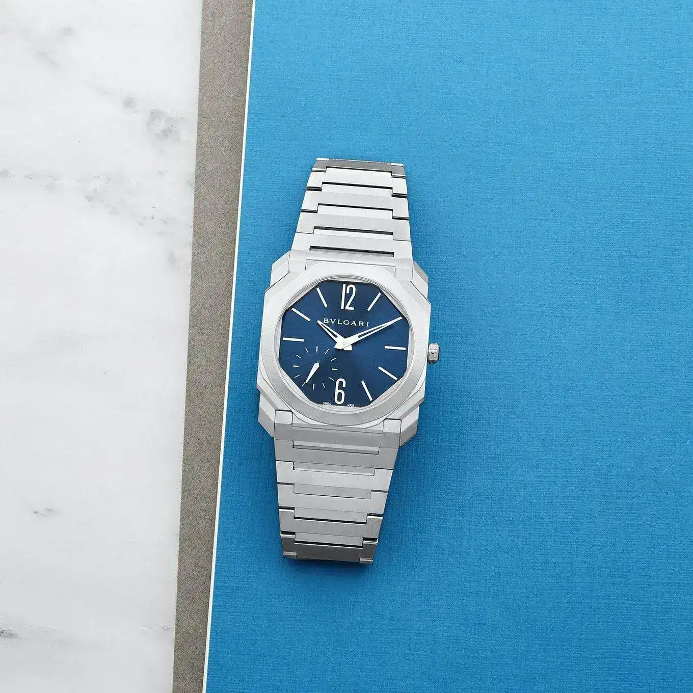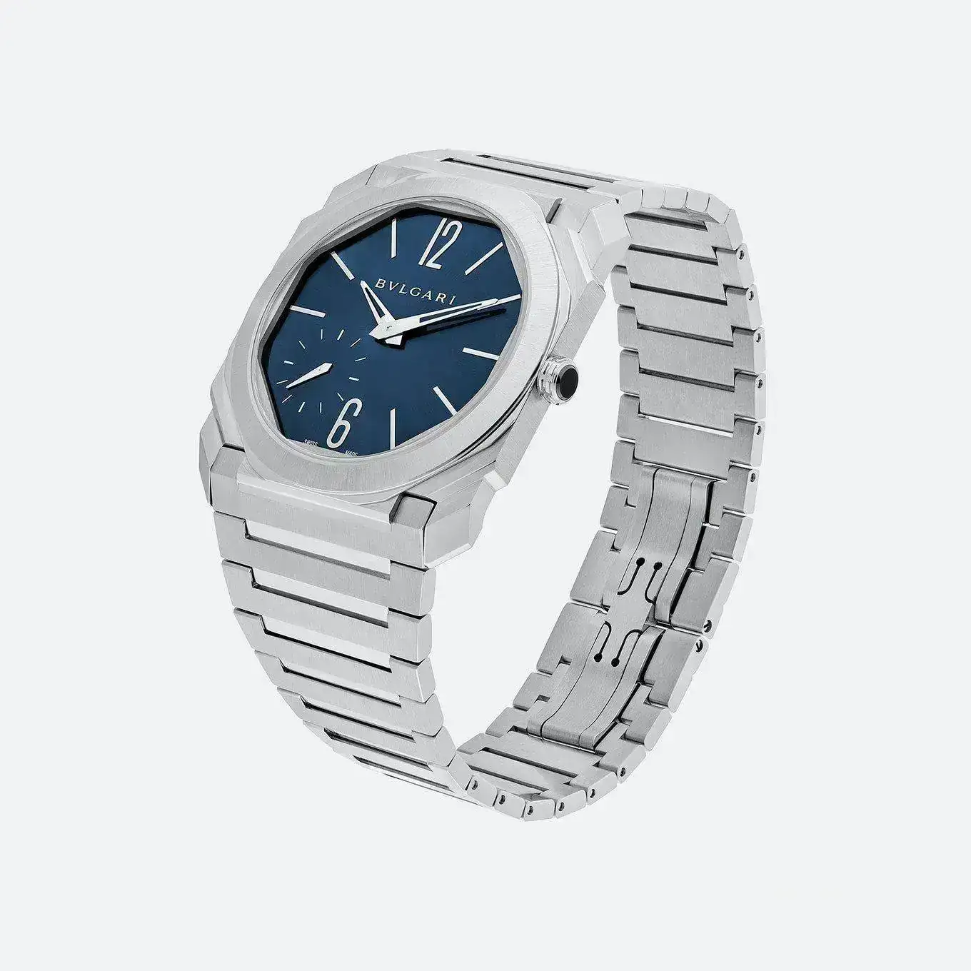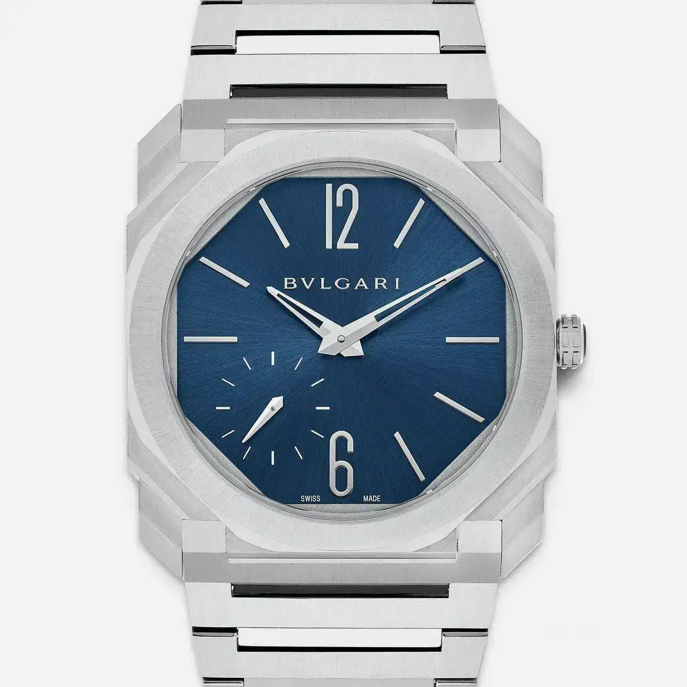 Estimado Llebeig,Año 2014: nace el vanguardista, sofisticado, innovador y creativo Octo Finissimo fruto de la evolución de la serie Octo que a su vez provenía de la marca Gerald Genta comprada por Bvlgari. Aunque no fue diseñado por Genta, las formas octogonales se inspiran claramente en el mítico Royal Oak del genio suizo. En 2020, su diseño octogonal, multifacetado, y de brazalete integrado incorpora el acero y la esfera (mejor dicho octágono) en espectacular y deportivo azul con acabado soleil o rayos de sol. De esta manera, Bvlgari entra por la puerta grande en el selecto terrero del reloj de acero deportivo de lujo con el añadido de su extrema delgadez con calibre de manufactura BVL 138. Encima tiene la osadía de desbancar momentáneamente al Altiplano de Piaget el cual este año ha vuelto a recuperar el record de delgadez. Caja de 40mm, hermeticidad de 100mtrs, acabado satinado pulido, cierre desplegable y espesor extrafino de 6,40mm. Precio: 12.100EUR.