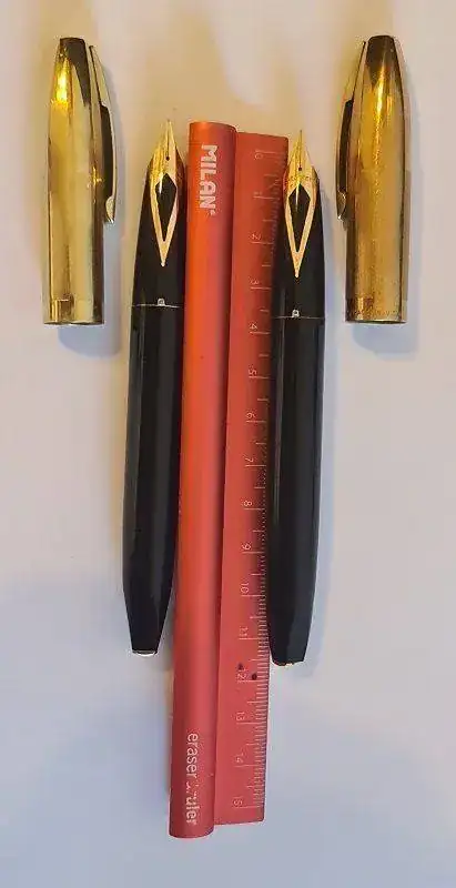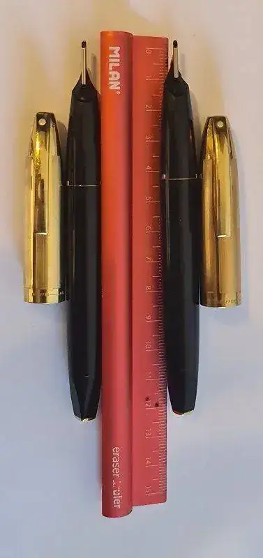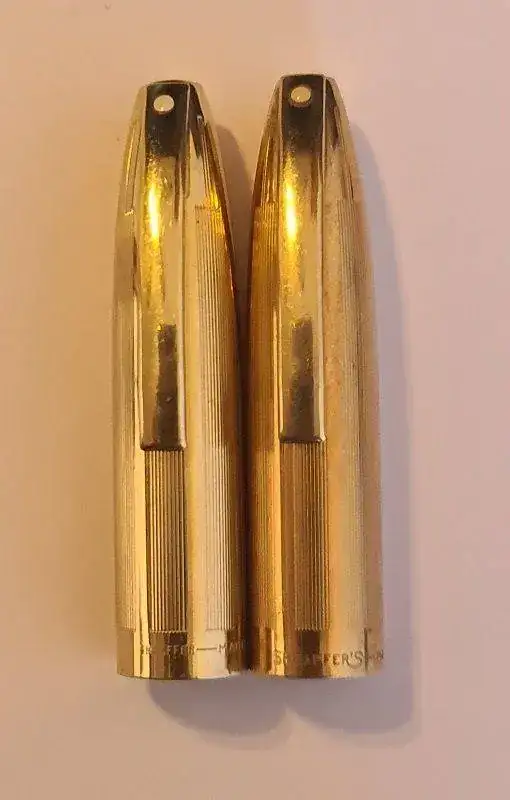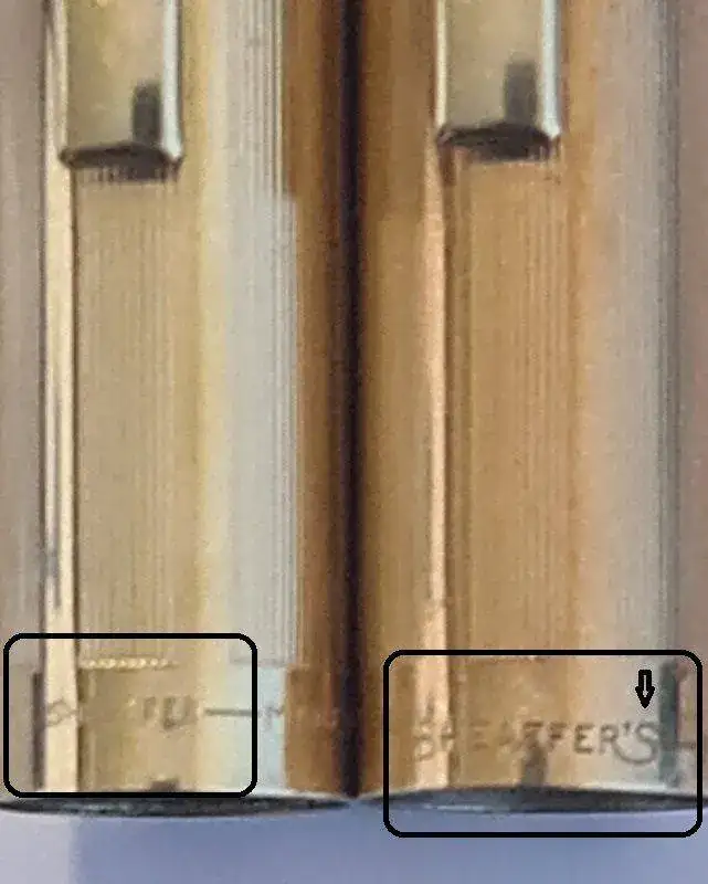 Mi intención era quedarme con la que mejor estuviera y la otra ponerla a la venta por 150 o 180 euros (aquí no porque aún no tengo el caché suficiente), pero resulta que no son iguales. En una, la leyenda del capuchón reza "SHEAFFER" y en la otra "SHEAFFER´S", lo cual me obliga, con todo el dolor de mi corazón, a quedarme con las dos. ¡En fin! ¿Qué le vamos a hacer?