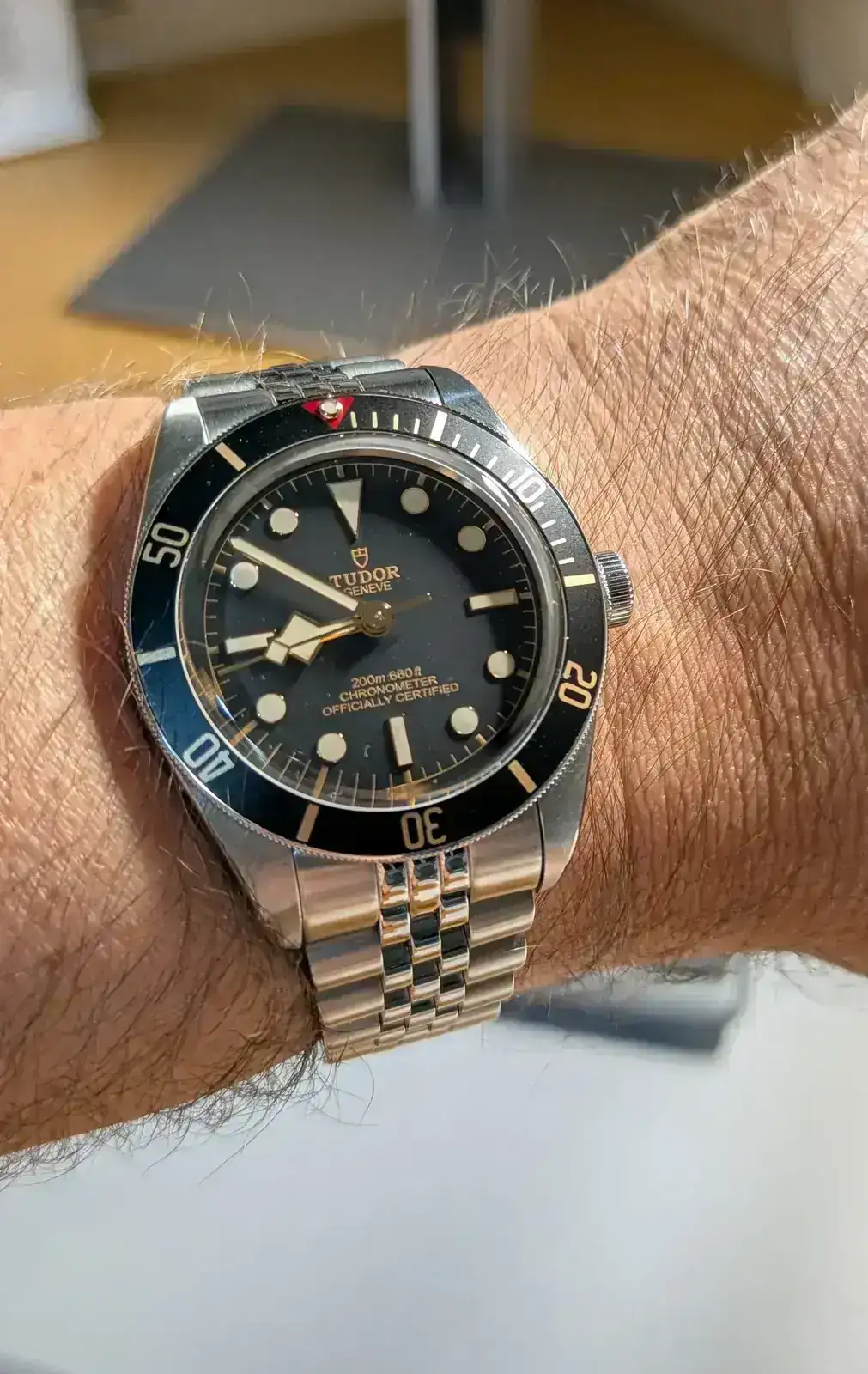 El siguiente es un titán, lo medite mucho y lo compré en 2023 en el Corte Inglés (lo sé, error de novato),Tudor Ranger 39mm (primera foto fuente “internet” pero es brutal). Me encanta su caja cepillada con esos detalles mínimos pulidos, la esfera en ocasiones se ve gris y otra negra, brazalete oyster perfecto aunque aún con el microajuste lo suelo usar en invierno ya que mi muñeca de 16.5 cm en verano varía mucho de diámetro y no me acostumbro a los brazaletes. Éste en por su parte a veces lo veo un pelín grande y en otras perfecto (un poco bipolar la verdad) es el típico problema que todo el mucho comentaba hasta que ha salido la versión en 36mm, que no he podido ver todavía, aunque no me veo cambiando uno por otro la verdad. También la aguja horaria a veces la miro un poco con recelo por esa forma tan peculiar que tiene (manías mías). Este reloj como no podía ser de otra manera va fino fino, +1seg/día, super contento con ello la verdad.