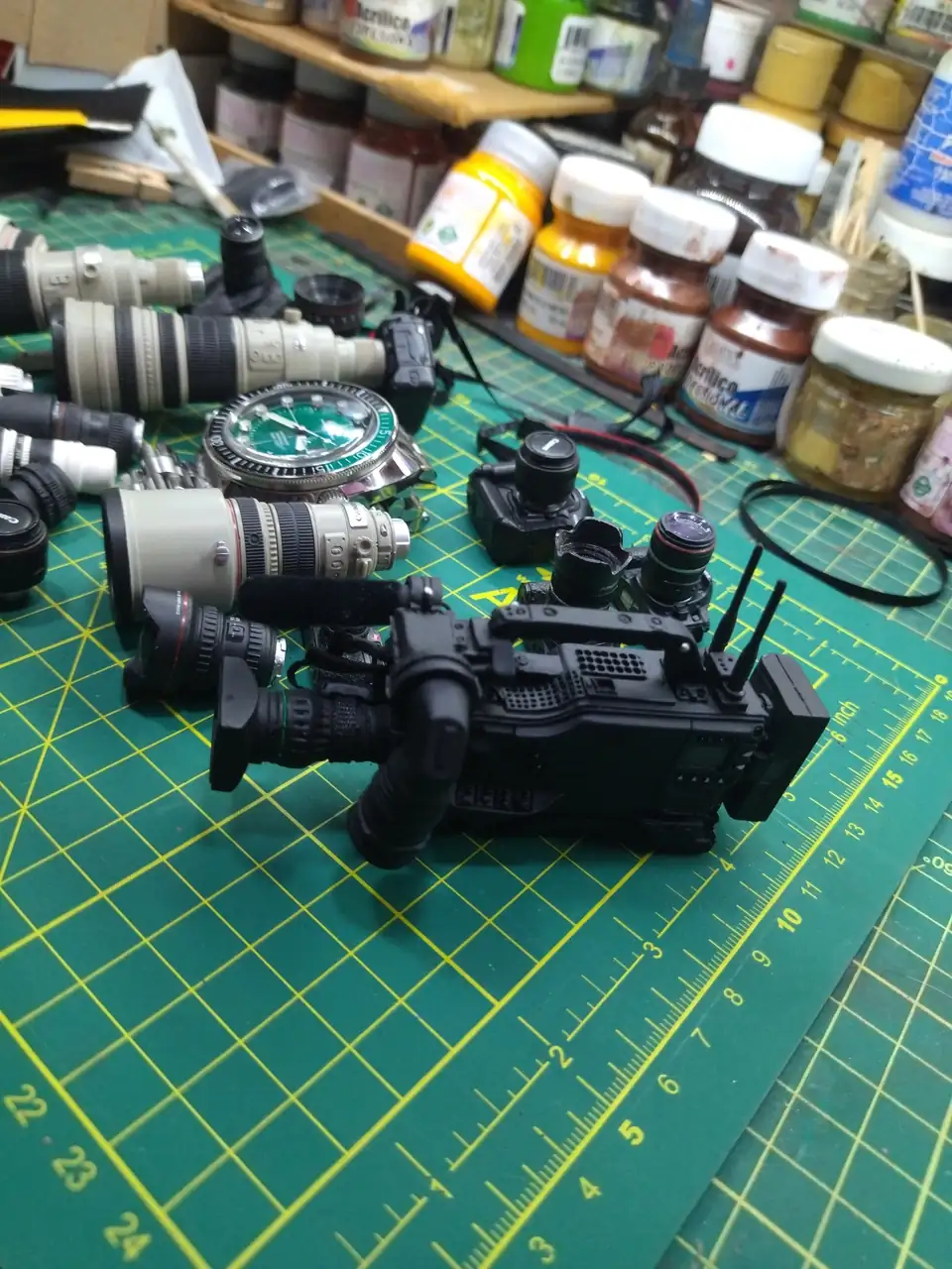 Menudo artista!Años de coleccionar figuras militares terminaron por cansarme, si bien conservo un monton de armas y accesorios ahora mi interes esta mas centrado en el tema civil, aqui una foto de mi coleccion de camaras a escala 1/6 con un mi "devil diver".