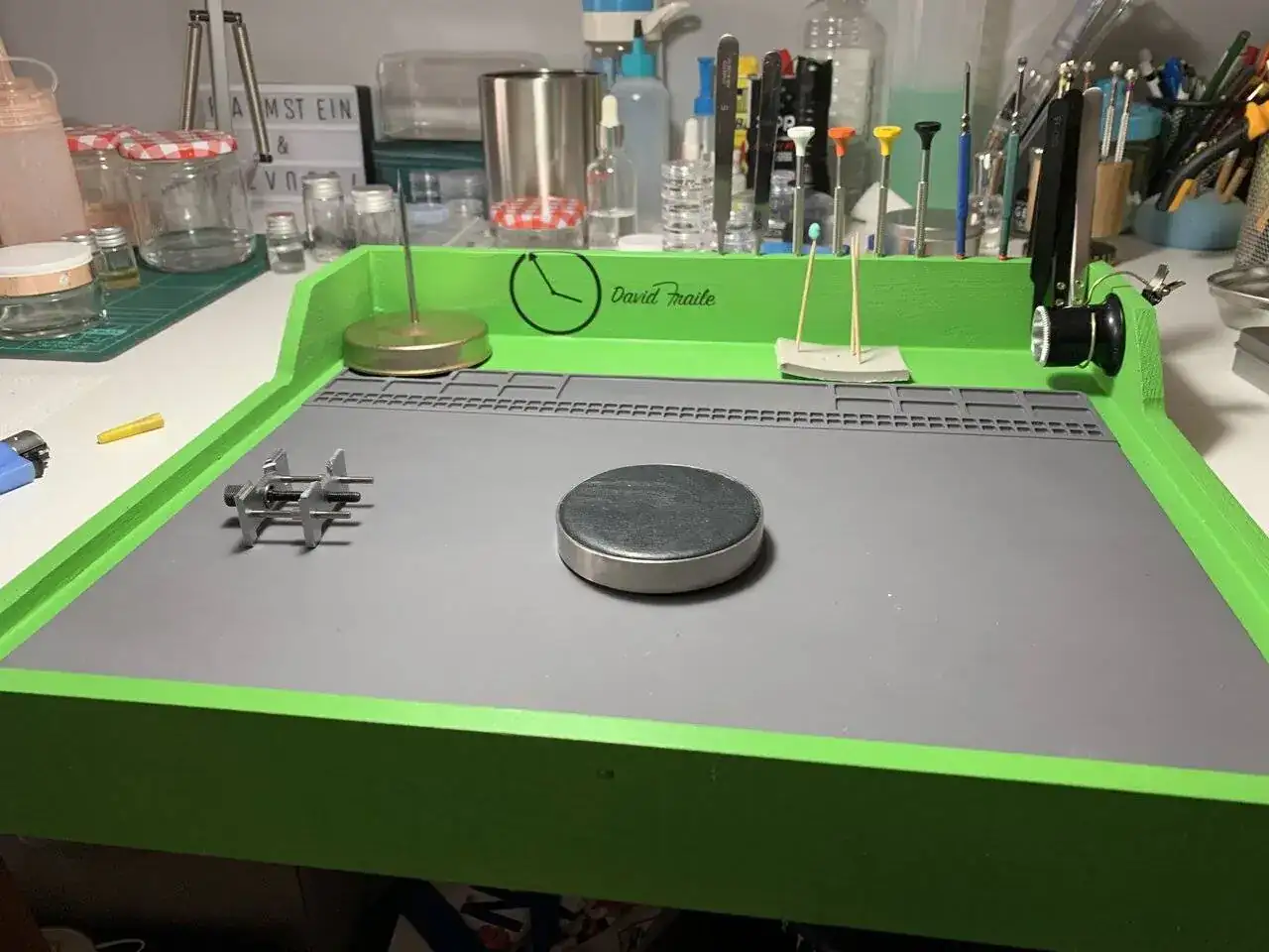Con unas tablas me hice un "cubículo" con escalón en los bordes para que no se cayeran piezas al suelo, pero vamos, lo del cepillo, imán y andar tirado en el suelo buscando tornillos entre las pelusas creo que nos pasa a todos de vez en cuando.