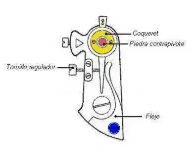 Raqueta: Pieza de acero formada por un aro encajado a rozamiento elástico alrededor del coqueret (sobre el puente de volante) y, generalmente, con dos brazos que salen del aro, uno corto hacia un lado, y otro más largo hacia otro. El brazo corto lleva dos pasadores hacia abajo (o una llave y un pasador, según se muestra en la ilustración superior) entre los que va la última vuelta del muelle espiral, apoyándose en ellos en un momento de su vibración. En posición de reposo la espiral debe hallarse en el centro de ambos pasadores, sin rozar en ninguno.El brazo largo (llamado índice, cola o flecha) apunta hacia una escala con varias divisiones y dos letras A de adelanto (F, fast, rápido, en inglés), y R de retraso (S, slow, lento, en inglés); girando la raqueta hacia la A se acorta la longitud de la espiral y, por tanto, ésta aumentará el ritmo de sus vibraciones; girándola hacia la R, se alargará e irá más lenta. El manejo de la raqueta se facilita en los calibres más completos mediante dispositivos que permiten mover el índice con precisión, como el que se muestra en la ilustración inferior, llamado cuello de cisne, consistente en un muelle de fleje que presiona la cola de la raqueta contra un tornillo regulable.