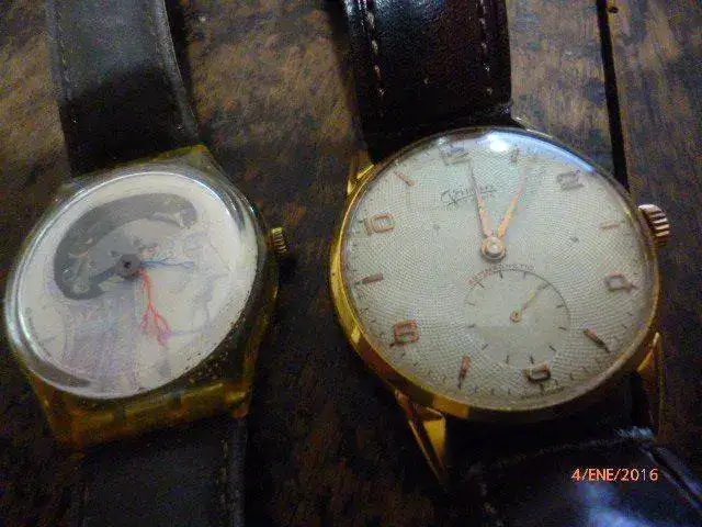PD: ya que estamos enseño un Swatch al que le tengo muchísimo cariño, pues me lo regaló alguien muy especial para mi cuando estaba en la facultad, y lo presento junto al reloj de mi abuelo, que si Dios quiere será para mi nieto(y no es un rolex, seiko, y ya no digo Patek) y como objeto, obra de arte, engendro mecánico, o lo más importante, como guardatiempos, no se pueden comparar ni por asomo, aunque tengan ahora el PVP aproximado