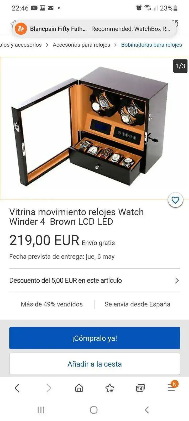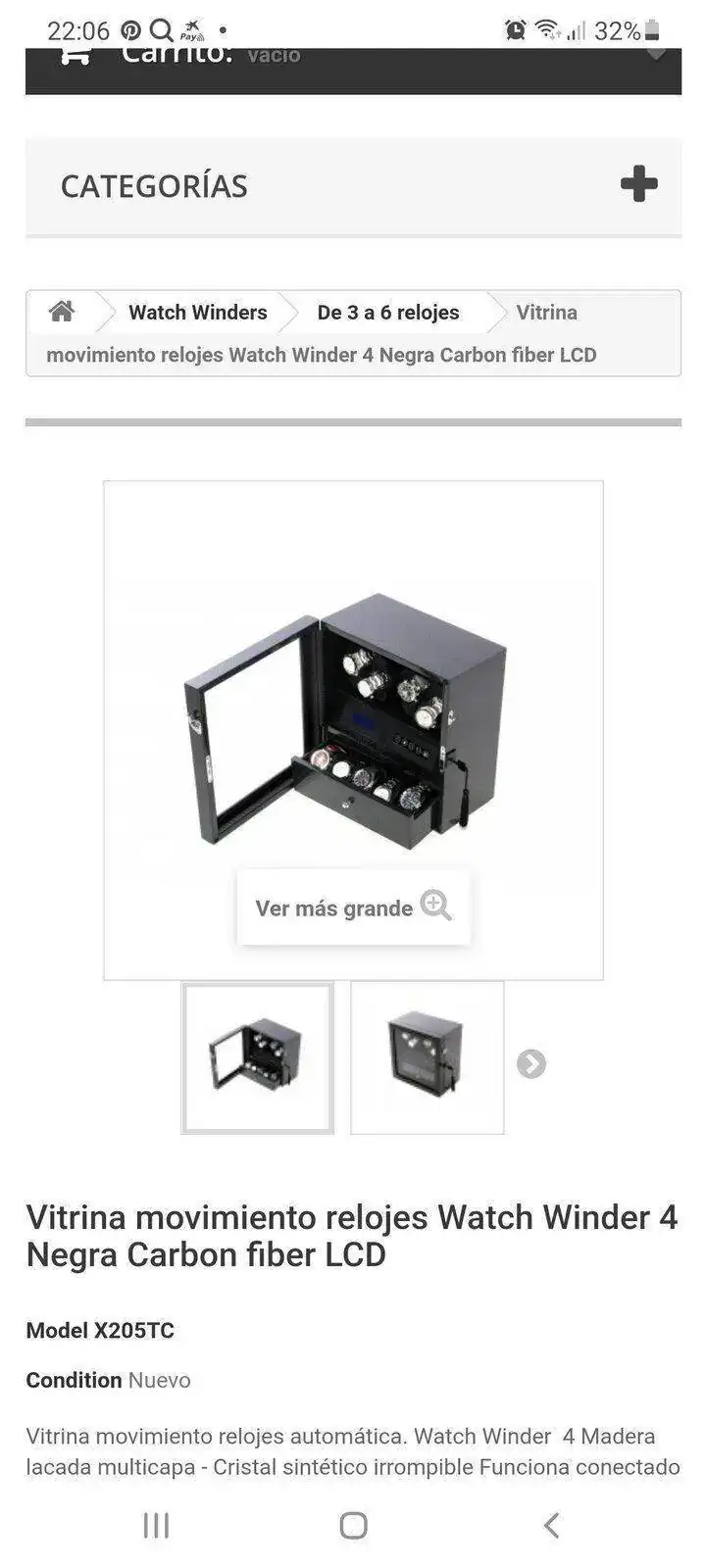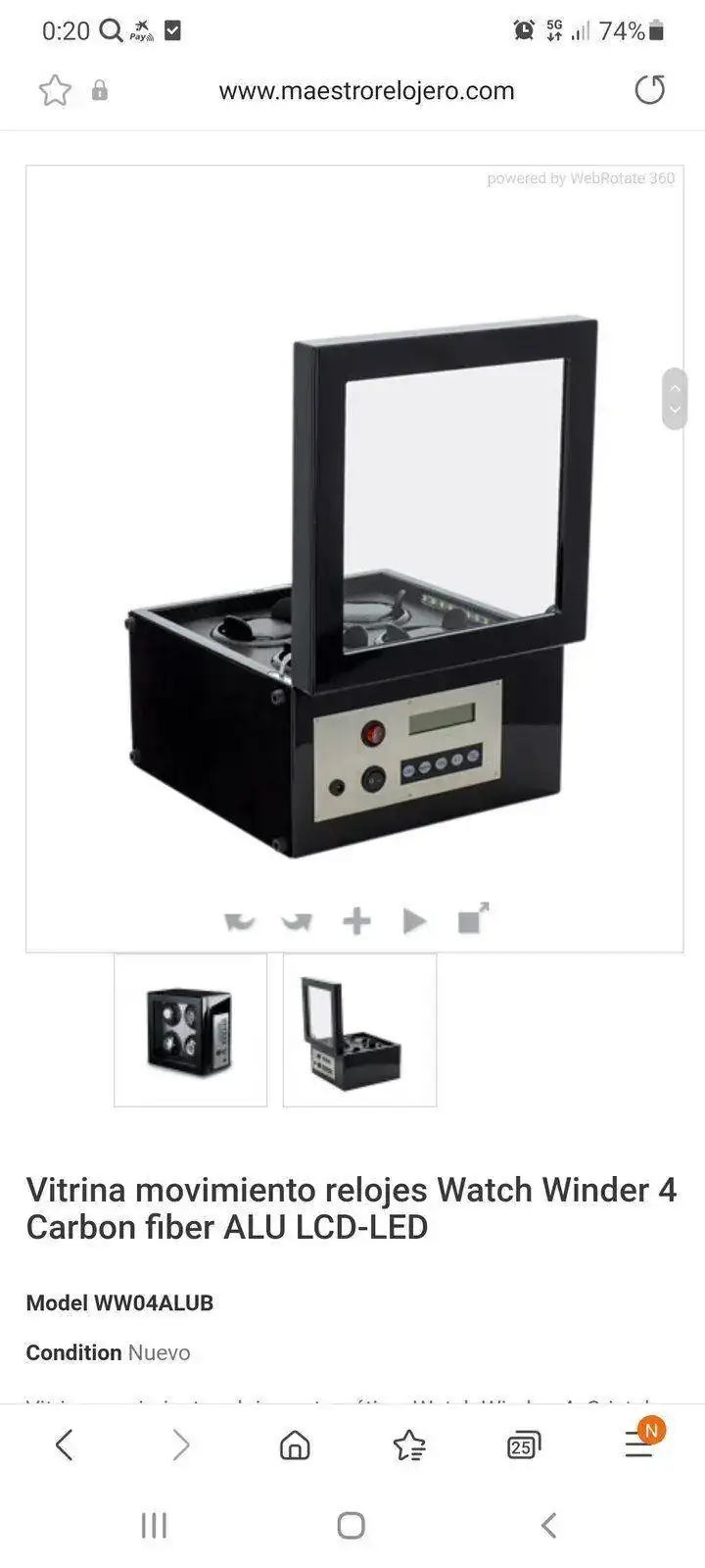 Buenas noches. Siguiendo el tema. Y por aportar ideas. Después de estar una semana viendo cientos de cajas online he visto muchas que podría comprar. Os dejo todas las que podrían ser la caja ideal. Cuando tenga la caja en mi poder os la enseñaré para valorar si he acertado o no. Lo que quería poner sobre la mesa es que buscar y que valorar de una caja. Pues depende de cada cual. Yo buscaba. Cabida para 4 a 6 relojes máximo. Bonito expositor, es decir de madera o imitación mejor que plástico. Con distintas velocidades y sentidos de giro. Tener en cuenta cuantos motores tiene, hay cajas de tres giros pero con dos.motores. Las hay de cuatro carcasas giratorias con motores independientes....esto es para mi lo ideal, para dejar uno funcionando y los otros no...Menos importante pero que para algúno que este pensando comprar lo sea. Medidas contenidas. Y forma de exponer. Piensa en ello. Es decir no es lo.mismo que se vea de frente...desde arriba...de ambas maneras. Que tenga cierre con llave. Que tenga luz. Que la luz se pueda quitar y poner. Y lo más importante que te guste, no que le guste a otro forero o amigo...o sea la más vendidas.Y la garantía del fabricante claro. Todo ello con el mejor precio.