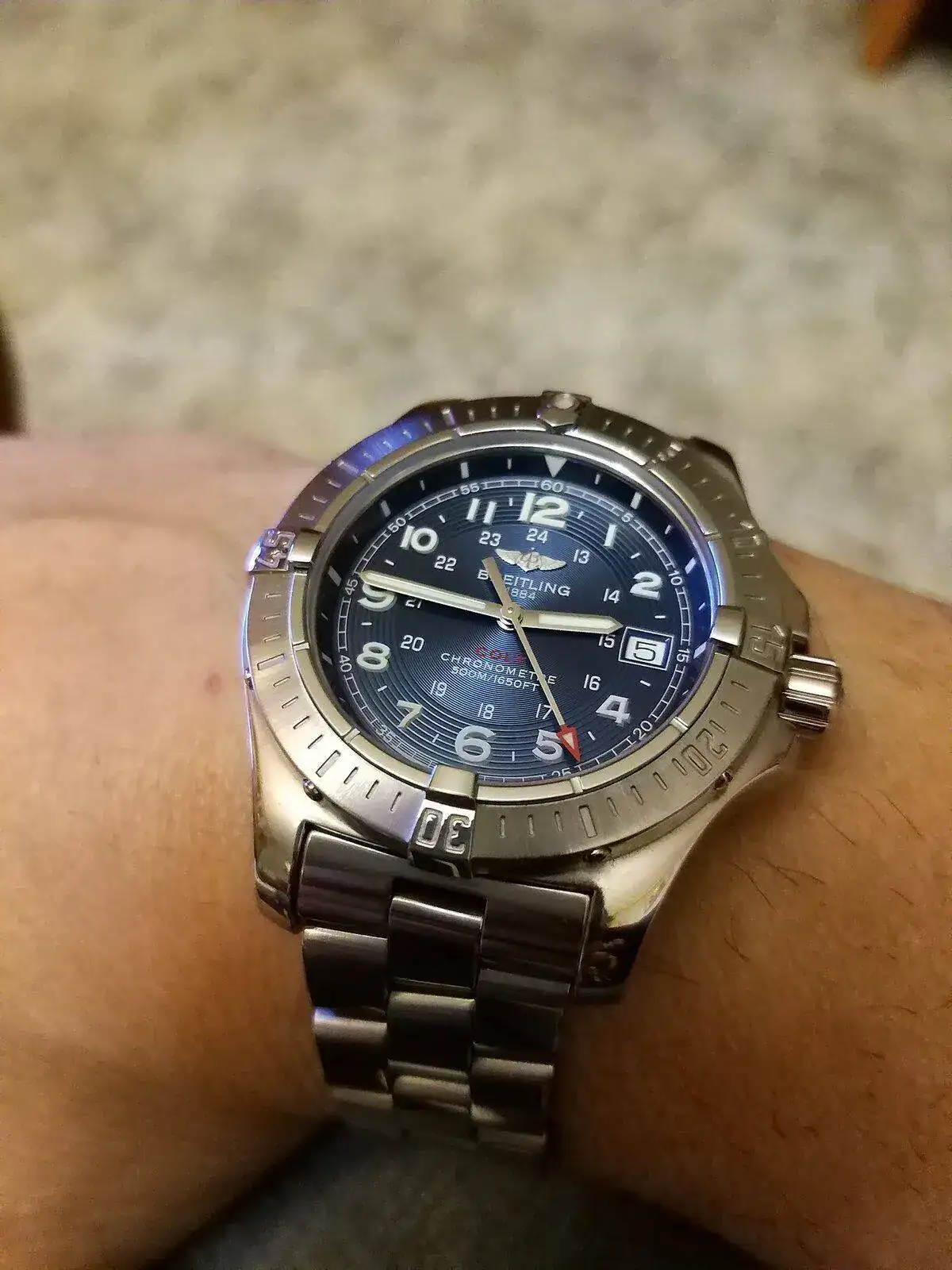 Pues no tengas dudas, son duros como qué. Al poco de tener mi Superocean salí a dar una vuelta, al cruzar un puente sonó un golpe de la virgen entre el reloj y una escalera de hierro que había al entrar, bueno no quería ni mirar el reloj, cuando me armé de valor lo miré y no vi nada, al llegar a casa y con la lupa observé una minúscula marca en el anillo protector del cristal, vamos que duros son un rato.Estoy valorando el Superocean, y el tema del anti reflejos externo en un diver no lo veo muy lógico, pero parece ser que es bastante resistente, los poseedores de un Breitling son los que me pueden sacar de dudas .