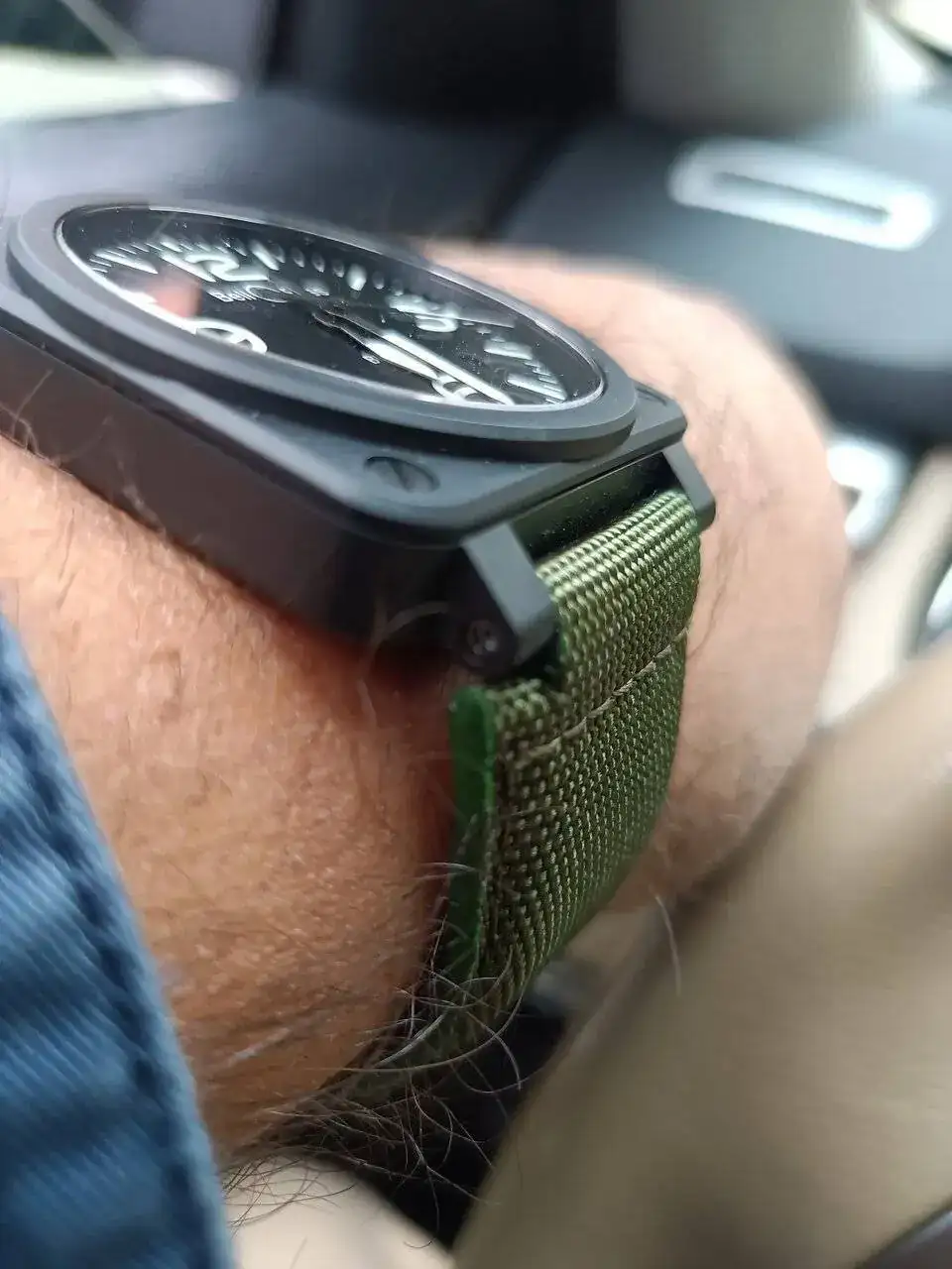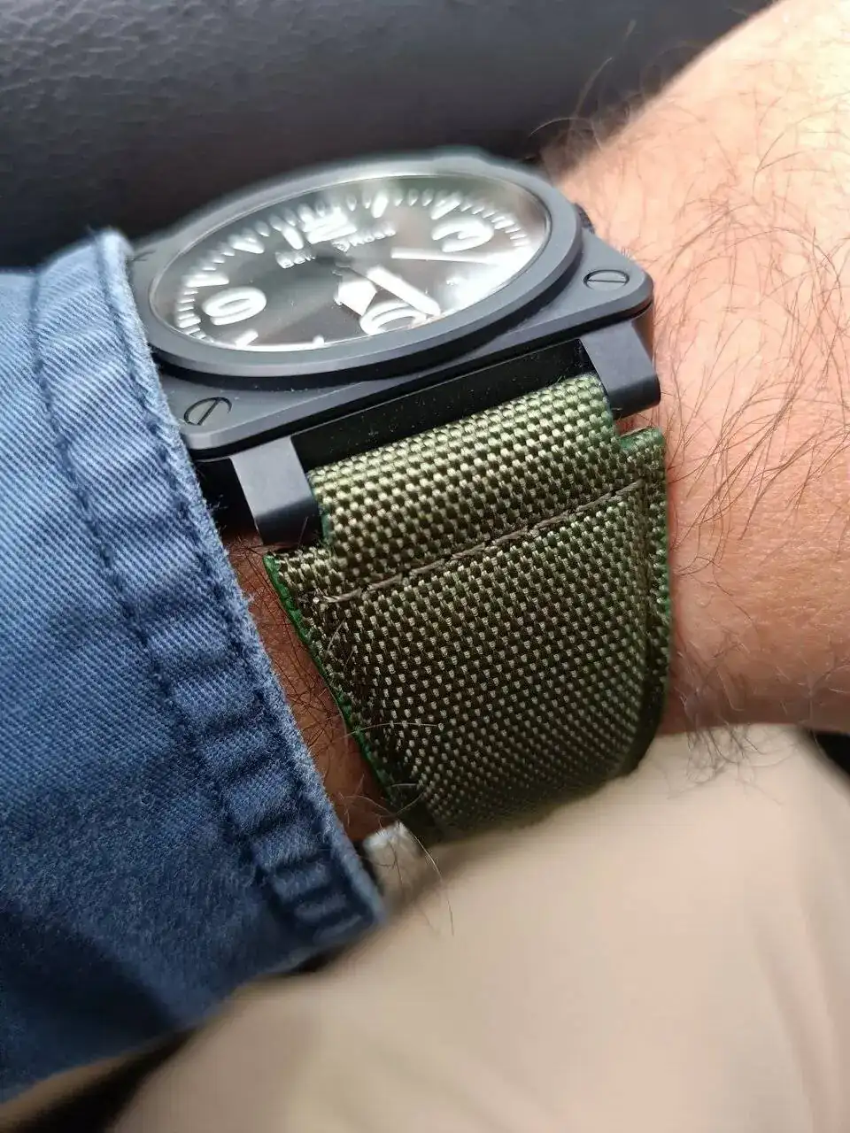 Que chulada, le queda super bien esa correa verdeAunque no lo parezca, porque siempre lo he llevado con una correa verde, estrenando correa de cordura también verde, de BR bands. Gran calidad, pero algo corta.