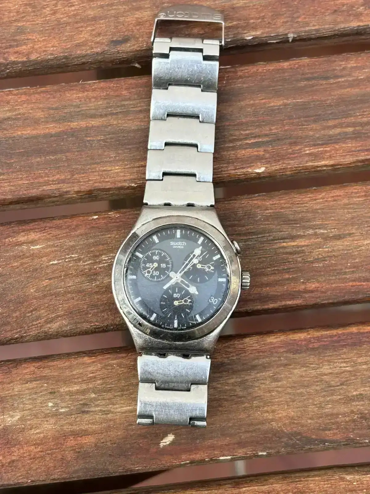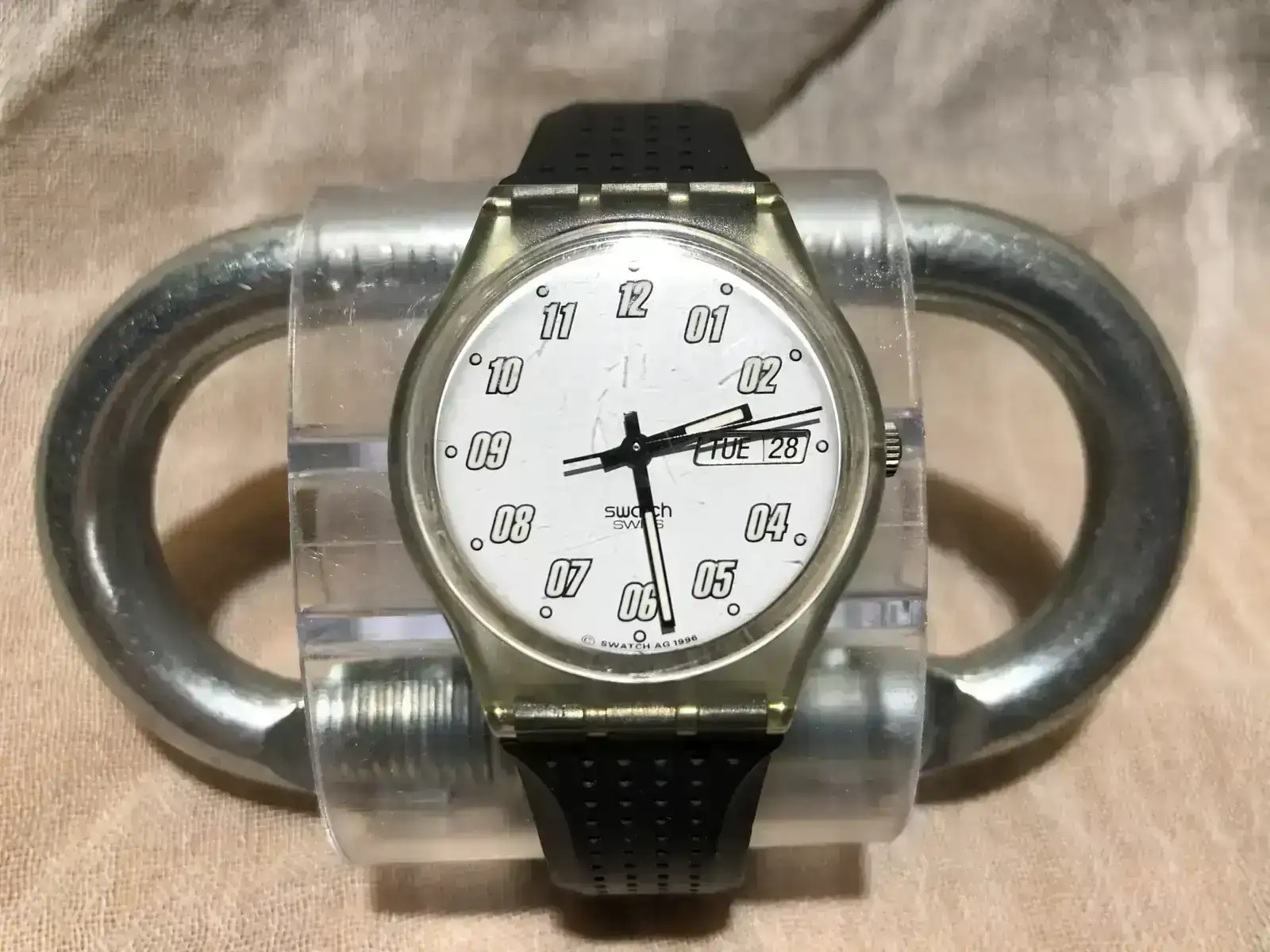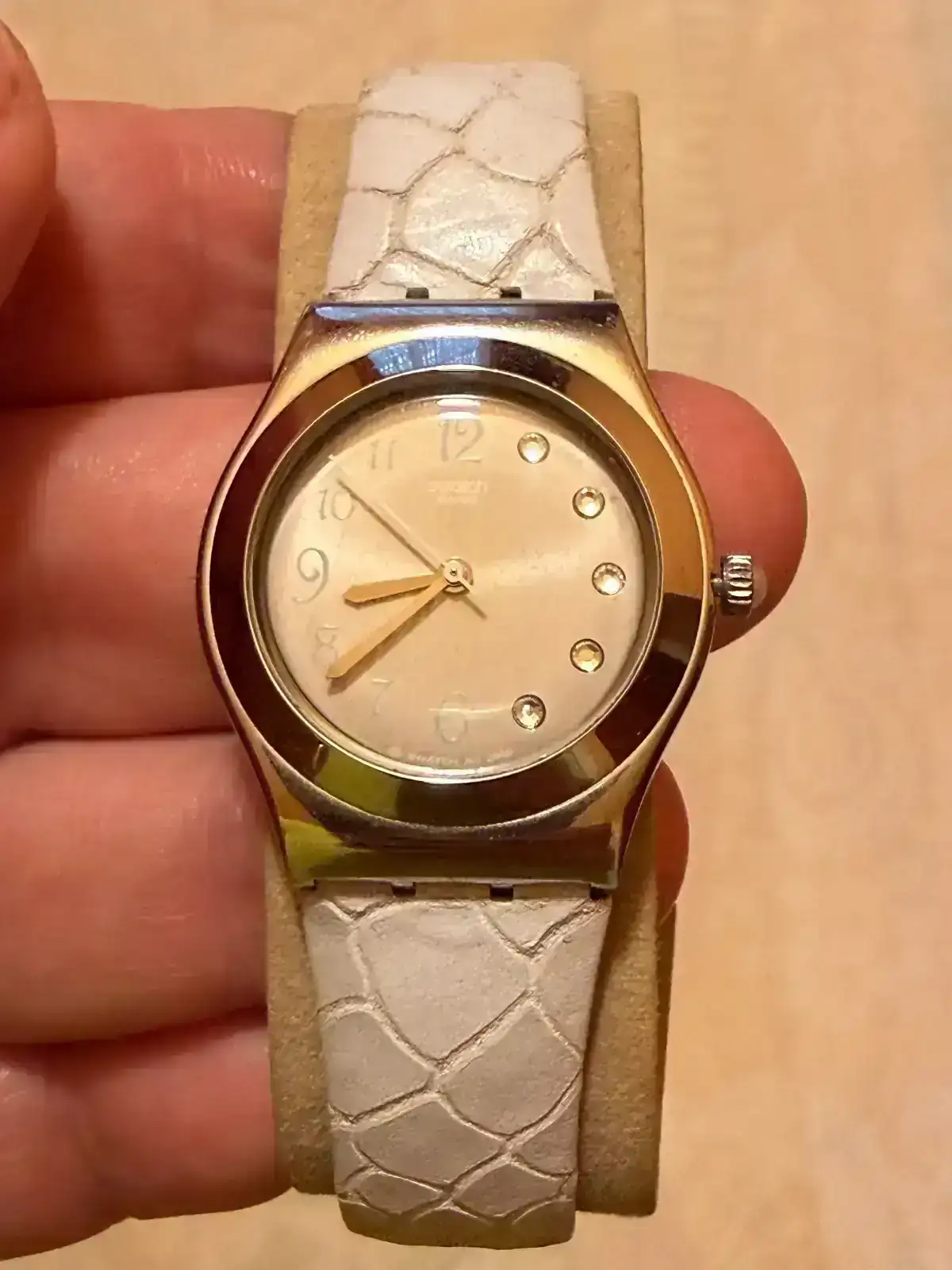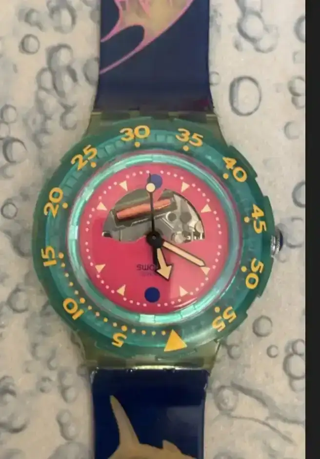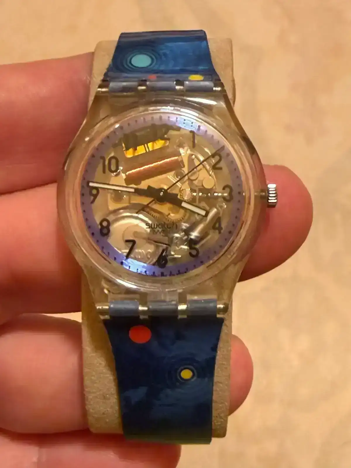 Es de mi hijo mayor. Se le regaló por su 1ª Comunión, apenas lo usó y, cuando se fue a vivir a otra ciudad para estudiar su carrera, me dio nostalgia y fui a ver este relojito. Estaba parado (nunca se le cambió la.pila de origen). Le hice lo poco que un Swatch te permite: abir el compartimento de la pila, limpiar los bornes e intentar resucitarlo así. Le puse una pila nueva y, tras unos segundos (parecía una de esas pelis de médicos en que el paciente no recupera el pulso después de meterle las palas eléctricas ésas😄) se puso a funcionar. Qué emoción!!!