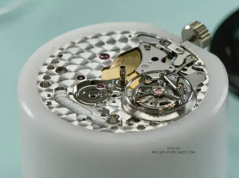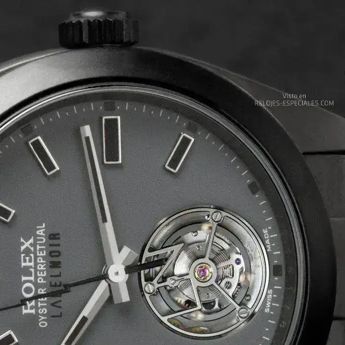 Hubo que retrabajar la pletina base (que se conserva, con su número de serie intacto) y desmontar el órgano regulador para poder implantar en su lugar la jaula del tourbillon. Cirugía micromecánica para resolver los desafíos mecánicos que esto planteaba y "cirugía estética" para abrir la ventana en la esfera transformada, pero que conserva los índices originales. Aunque tratadas, las agujas también son las originales del Milgaus que una vez fue un 116400