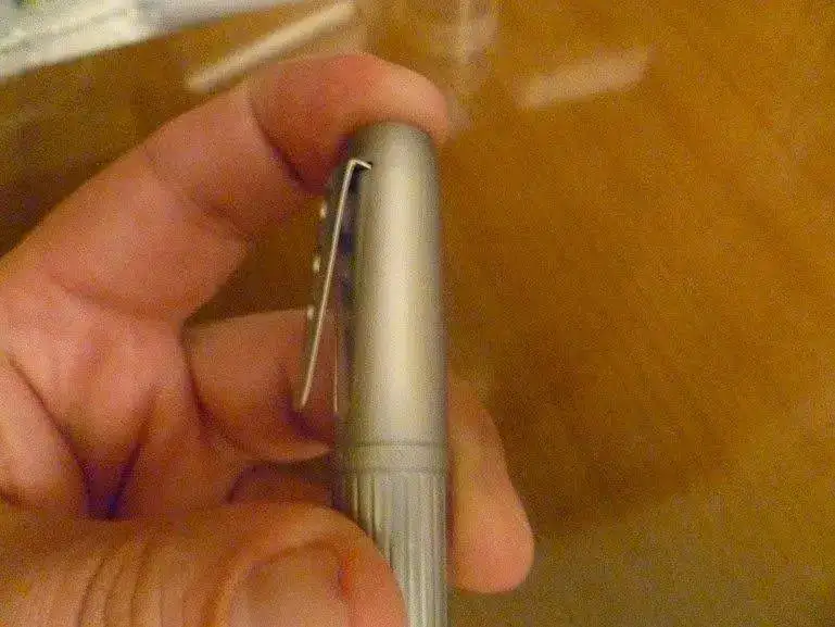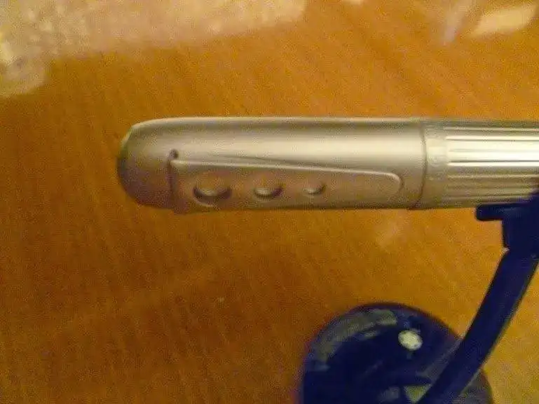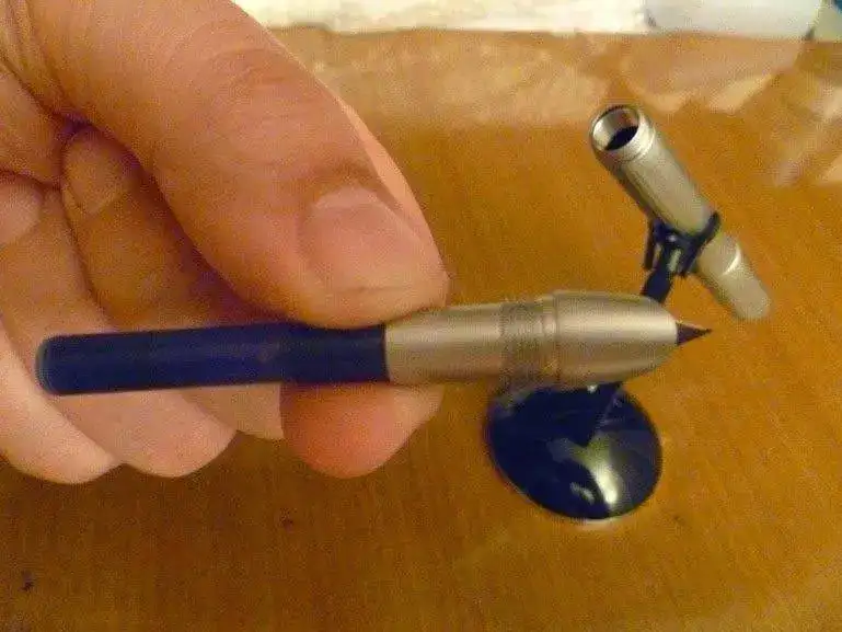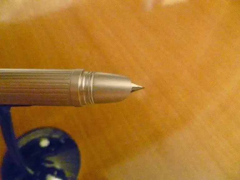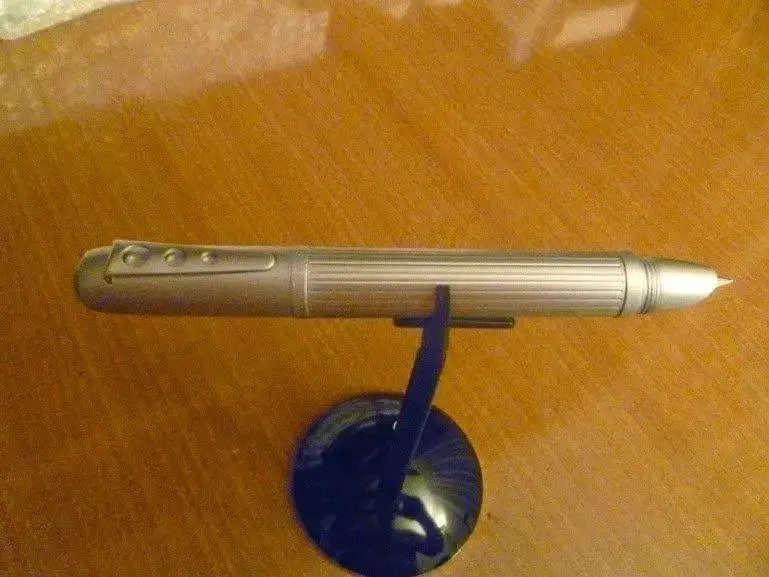 Desde luego, el diseño es diferente. Con plumín "F" un poco grueso, escribe muuuyyy bien. En la foto muestro un cartucho, pero venía con un convertidor. El clip está, como veis, totalmente pegado al barril, y, ya estaba pensado que no era nada práctico, cuando descubrí que pulsando el botón del culotte se abría. Por cierto, que si se coloca en la camisa con dicho clip la pluma queda boca abajo, da algo de mieditis...