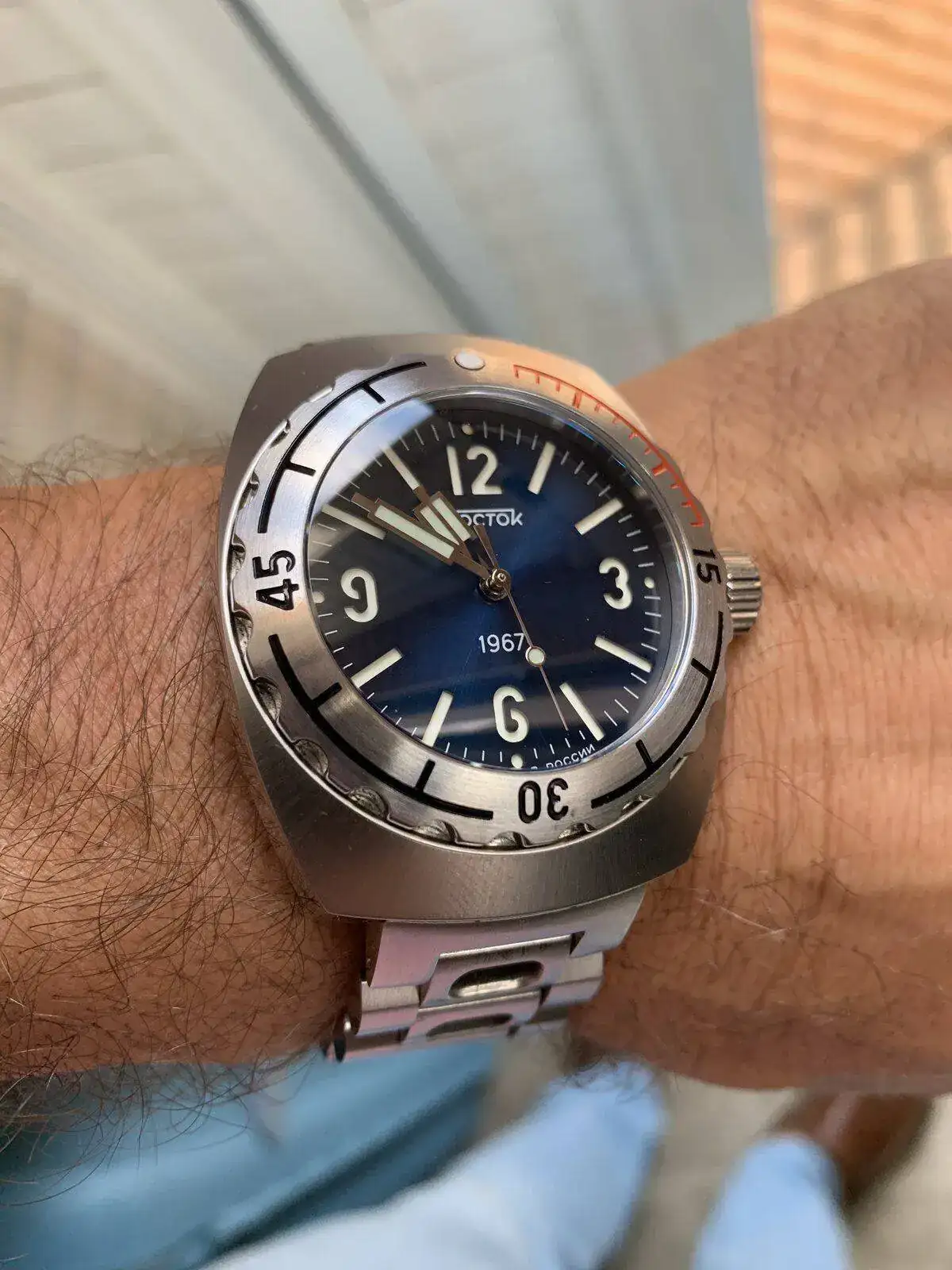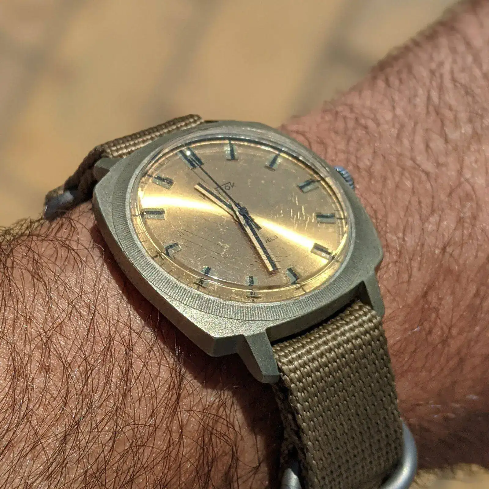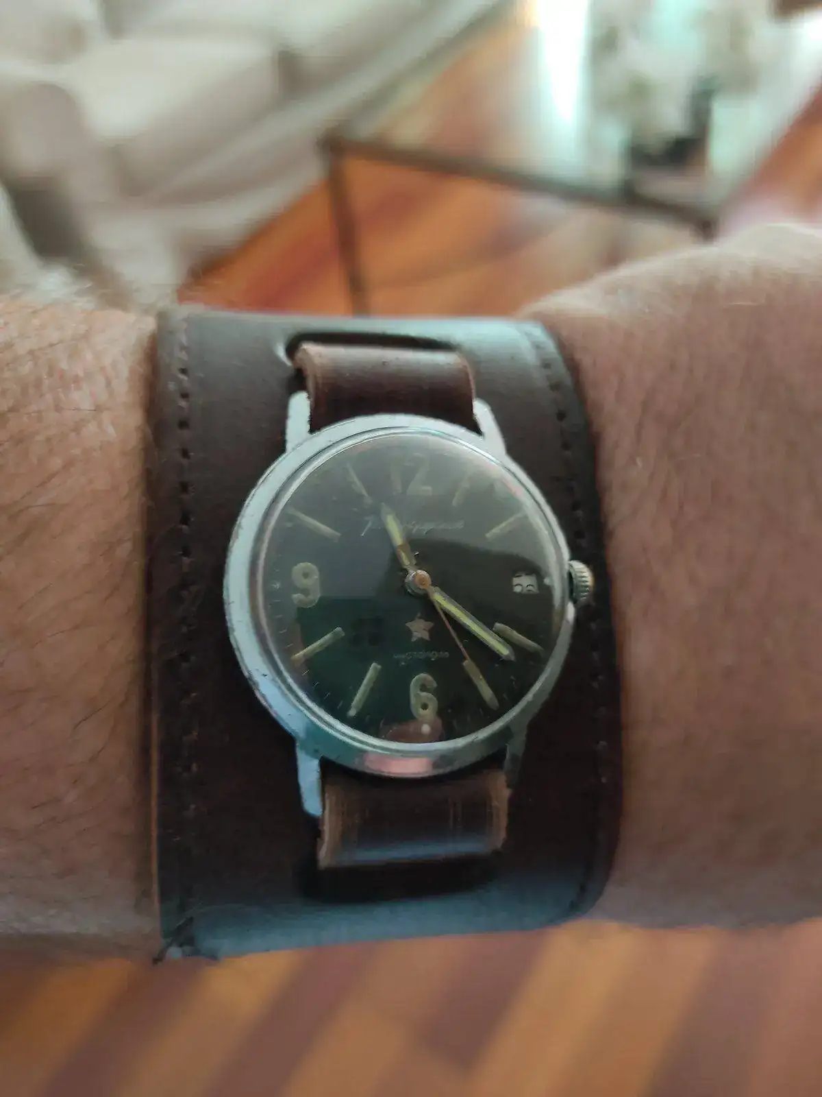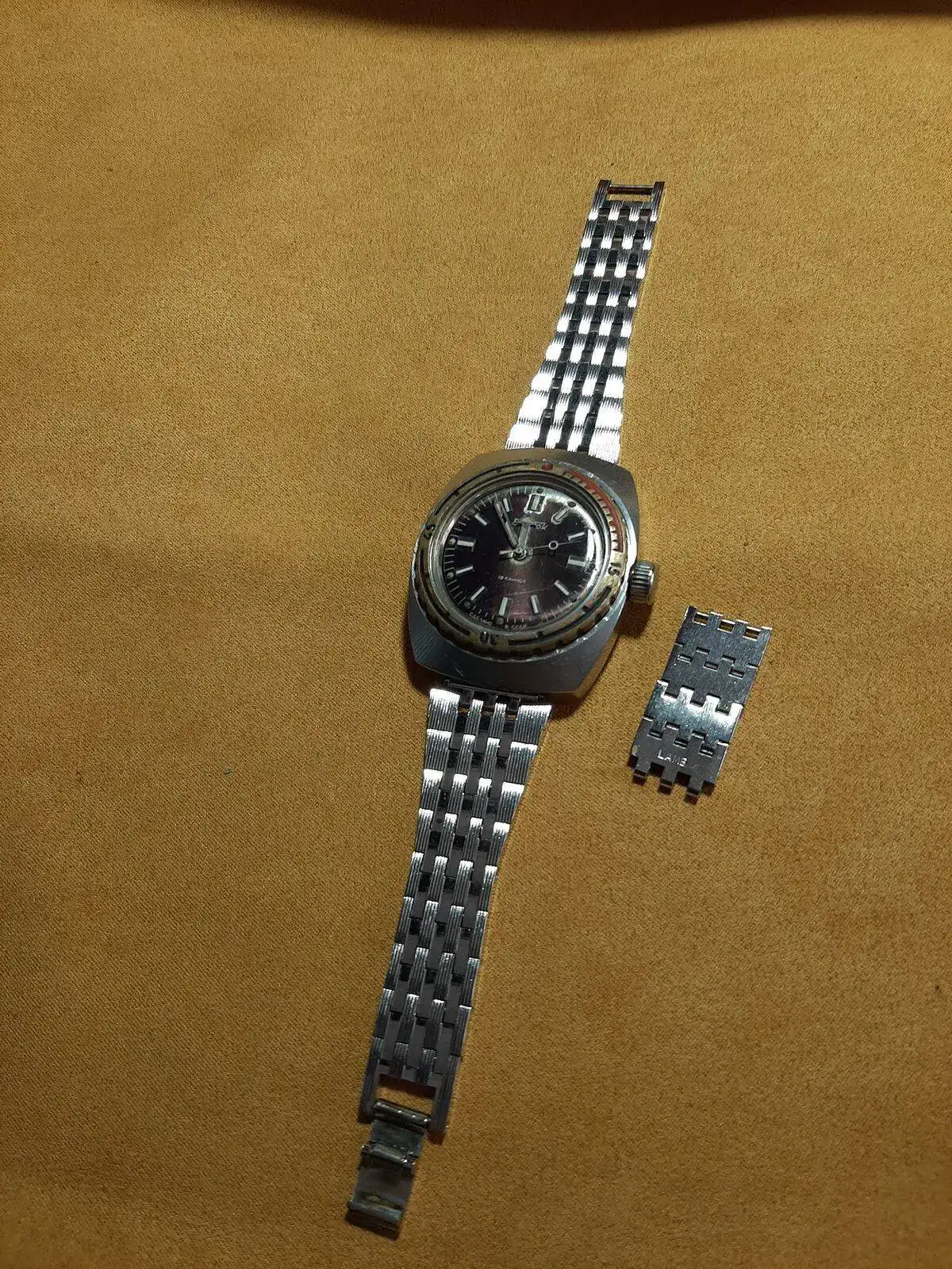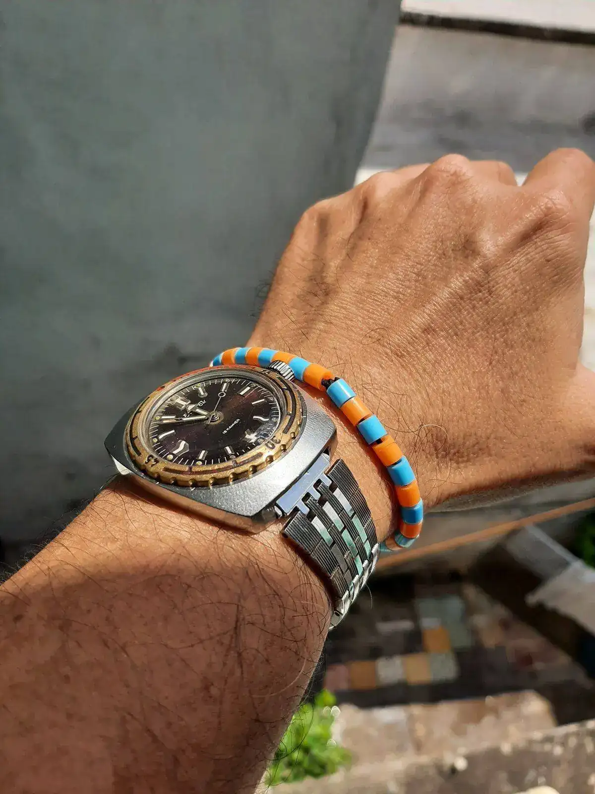 Impresionante los brazaletes que tienes. Este es una pasada me encantaHola colegas, hoy con este, no pude soportar la tentacion y le quite el bisel para una ducha de acido , y tambien hallé en el fondo de mi caja de correas un brazalete vintage, cromado, el unico que tengo en mi caja (lo consegui en estado NOS, pues no tiene huellas de uso, en un lote de brazaletes que compre hace tiempo), hasta ayer por la tarde descubri que era cromado, siempre pense que era de acero, y lo tenia muerto de aburrimiento en el fondo de mi caja de brazaletes.