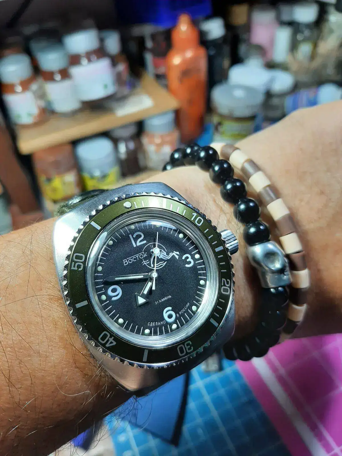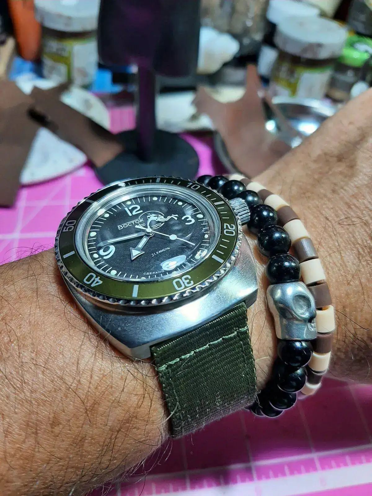 Exacto, en homenaje a su linaje militar, este reloj en particular me encanta, porque es un "lienzo en blanco" para el tema de los biseles, lo he traido con biseles rojos, verdes, naranjas, amarillos, negros y con todos se ve bien, ahora con este bisel verde olivo, creo que lo mantendré un rato así.El Amphibia-field watch!![]()