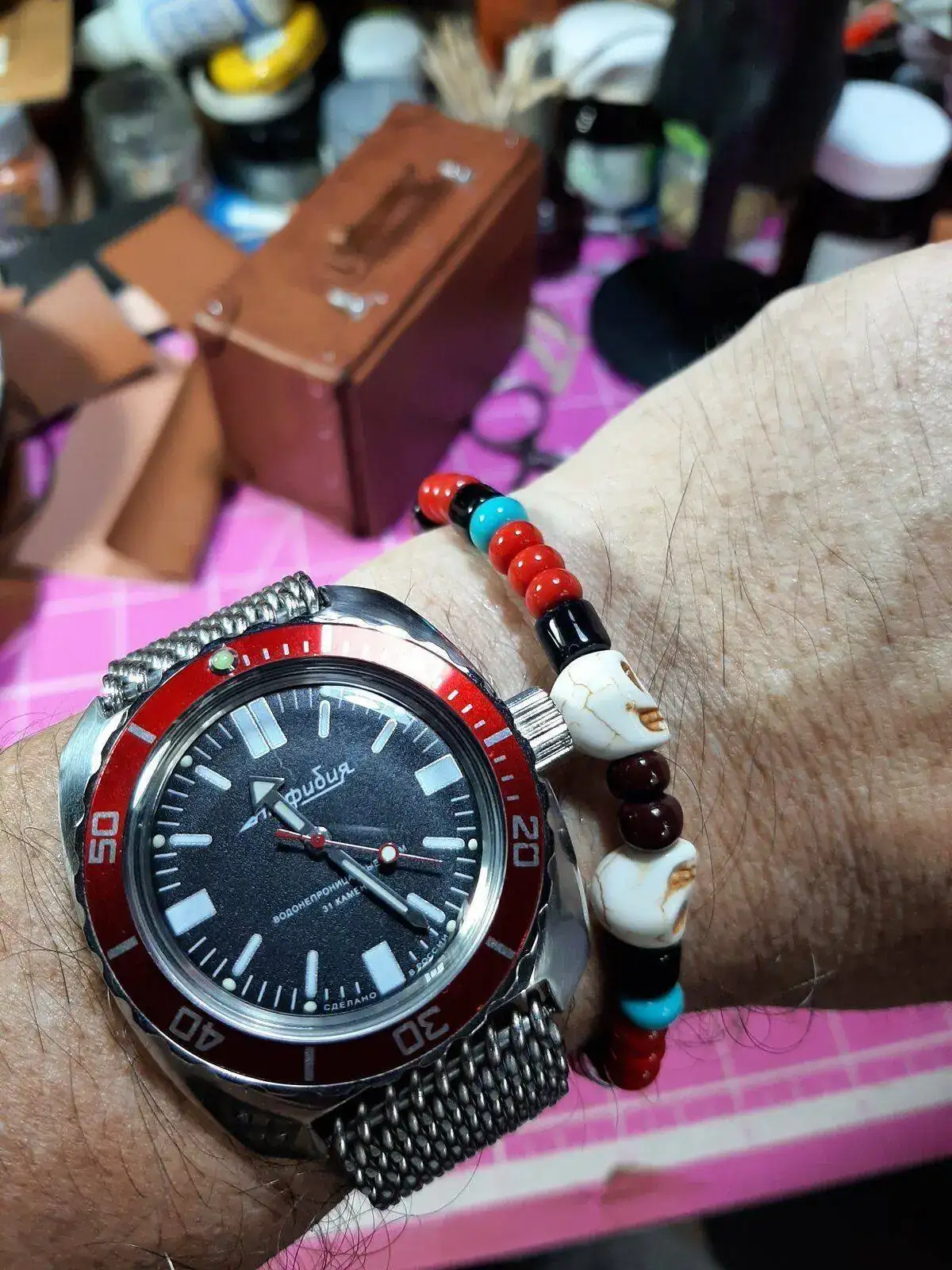 Te ha quedado genial. Yo también estoy a la espera de un bisel rojo para poner a un dial negro!Con el recien llegado, apenas lo recibí le calce este bisel rojo, queria un diver con dial negro y bisel rojo, con caja contundente,sin datario, y el elegido fue este.