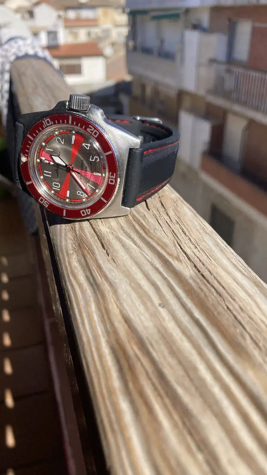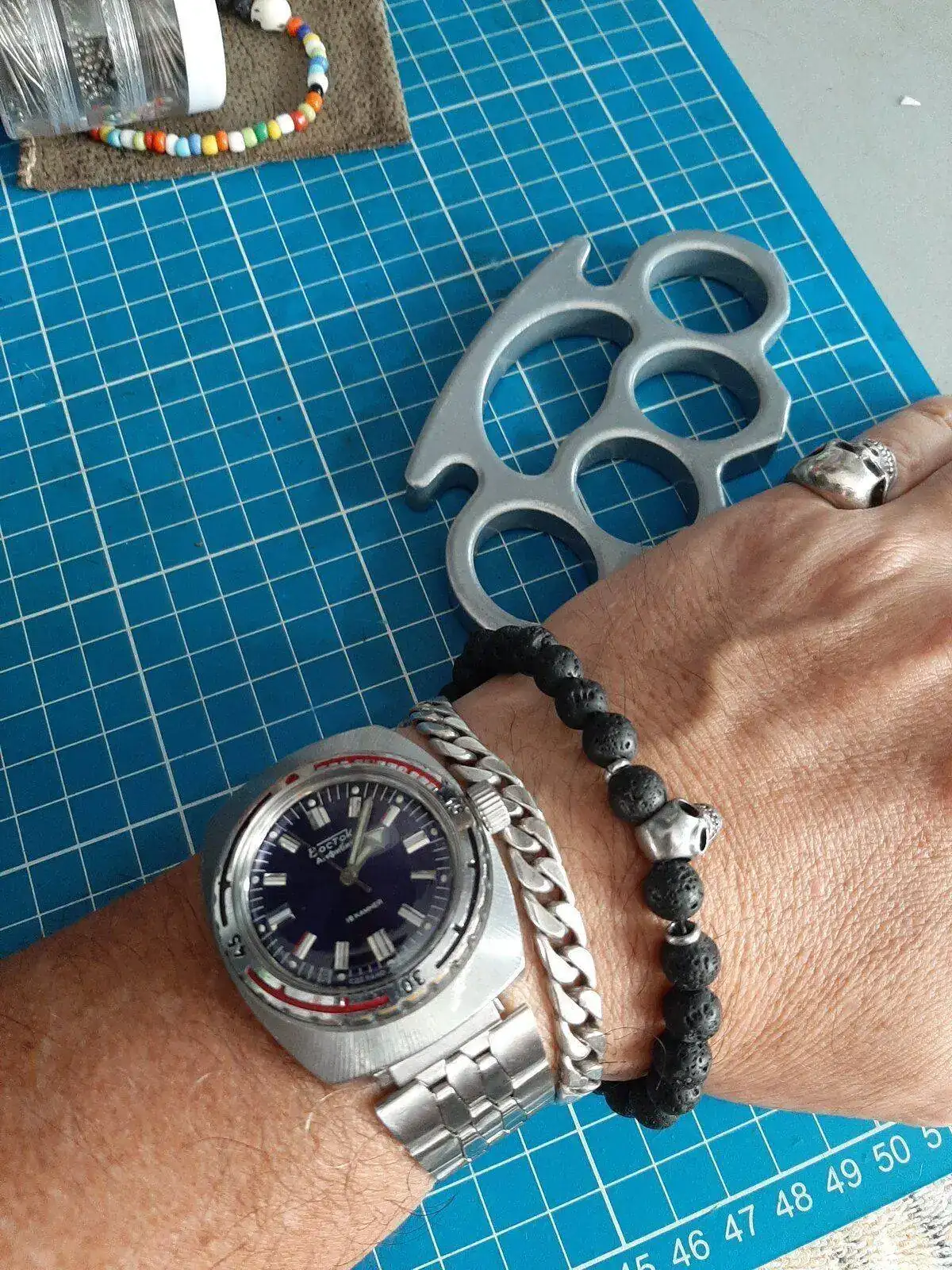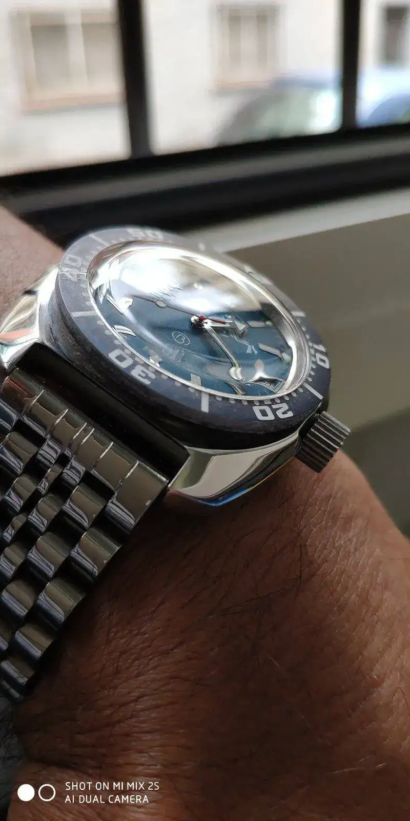 Ya de vuelta del relojero, ahora si, este pequeño, marcha como un campeon, le he puesto el brazalete "coffin link", de la epoca, que le queda perfecto en mi opinión.