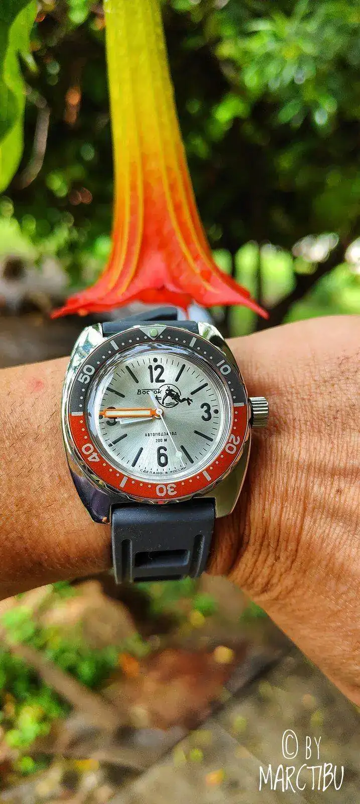 Debajo de la flor del trompetero rojo, (Brugmansia sanguinea). Bueno, más bien la flor de fondo.Buenos días camaradas, Amphibia & Cantuta.