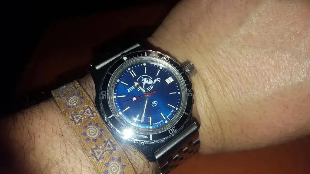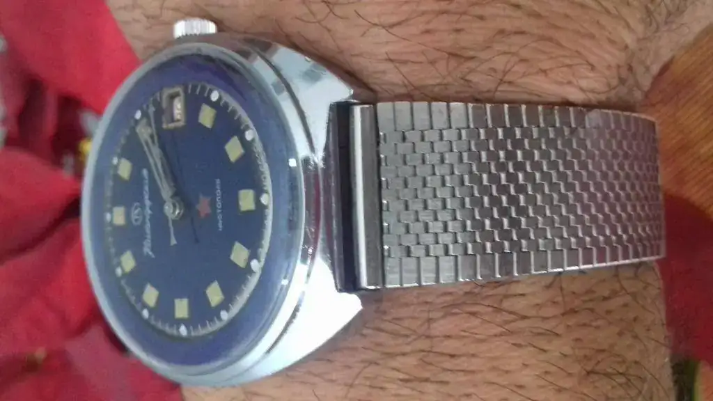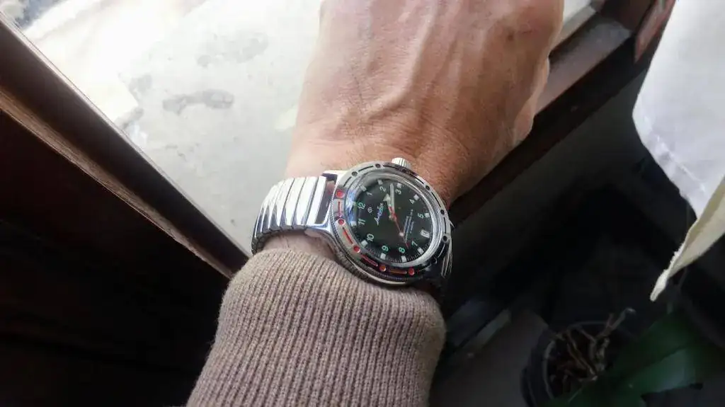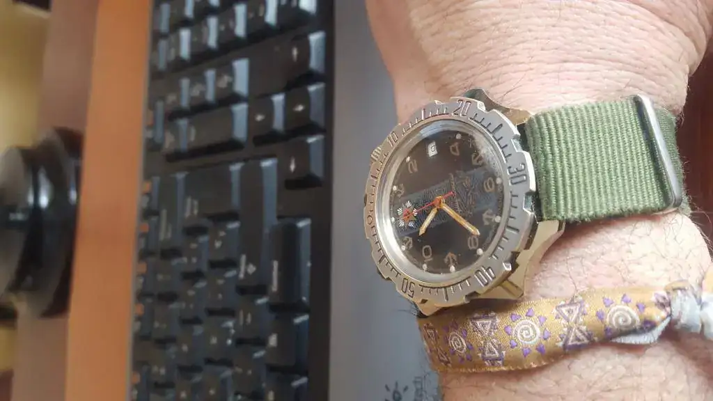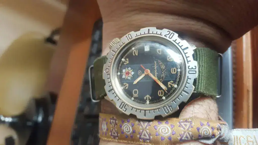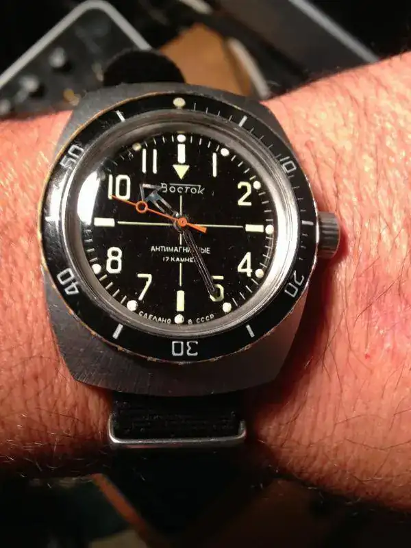 Pues hoy llevo este "FARSANTE". Me costó muy barato por Ebay desde Italia (18€ creo) y ya tenía claro que ni era ruso ni nada. De hecho es plástico imitación de acero y, a pesar del cierre de cantimplora para proteger la corona, tiene de sumergible lo que yo de astrofísico. Realmente lo adquirí para comprobar cómo quedaría estéticamente un diver de este estilo antes de autoregalarme el que acabo de comprar del Akula. En todo caso, sorprendentemente, gusta mucho a la gente que me lo ve puesto. Ahí va.