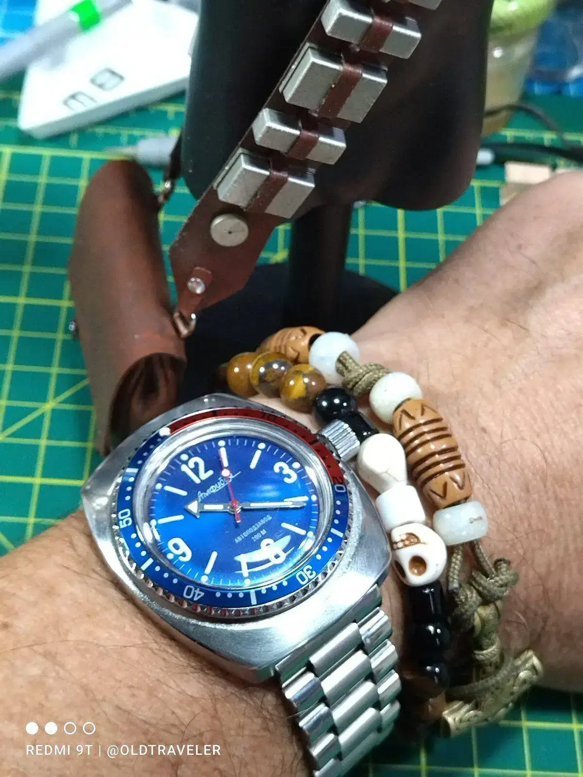 El reloj es esta belleza azul, con la caja original que originalmente era arenada, yo le di dos sesiones de lijado para darle un acabado que un colega del foro bautizo como "arepillado"