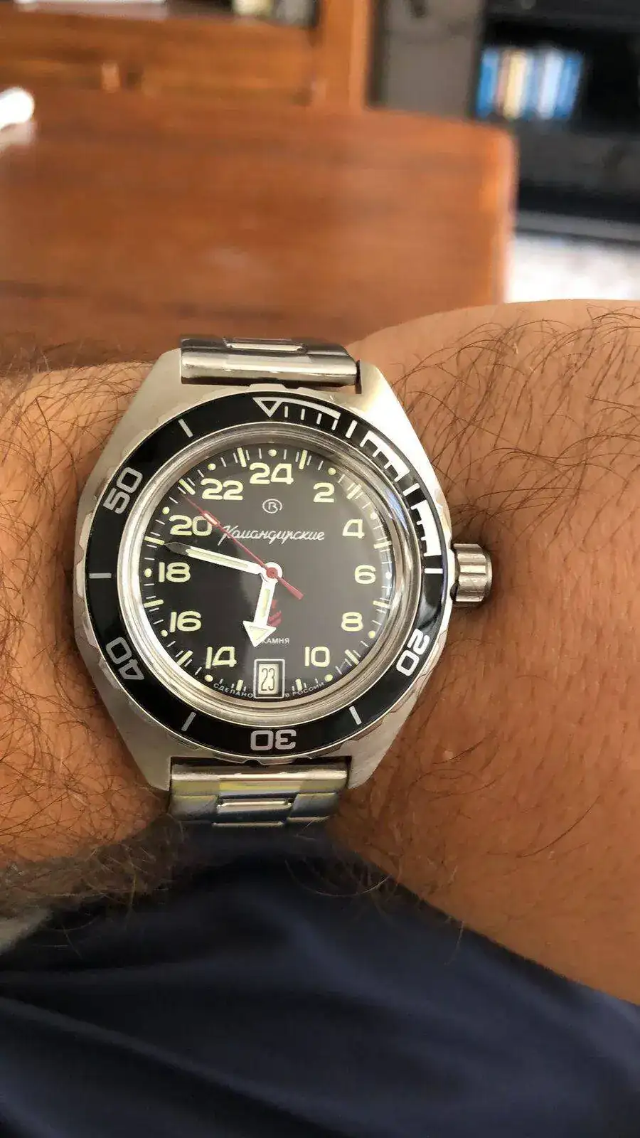 Es el que viene de serie. El mismo que el que lleva el Komandirskie 24 horas.Precioso. Ese bisel es como el de los nuevos dirskies, ¿no?