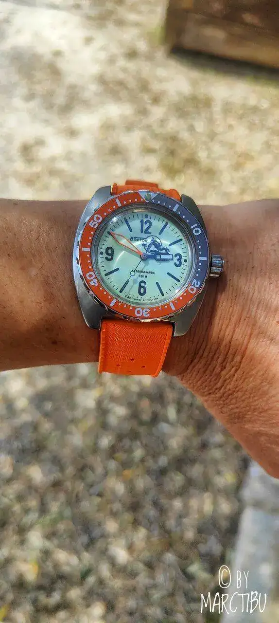 El brazalete no tiene marcas, probablemente es de manufactura artesanal, tiene su punto el colocar el reloj, y es muy comodo de portar, con relojes ligeros, un reloj mas "cabezon", hace que se balancee en la muñeca, pero con un reloj ligero como el Raketa, se queda en su sitio comodamente asentado.