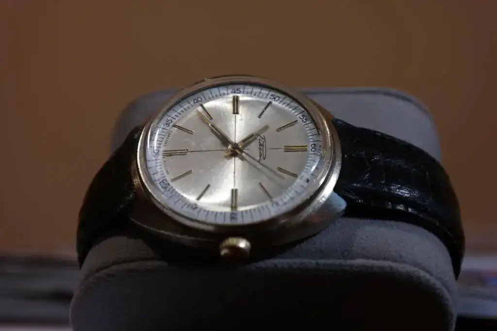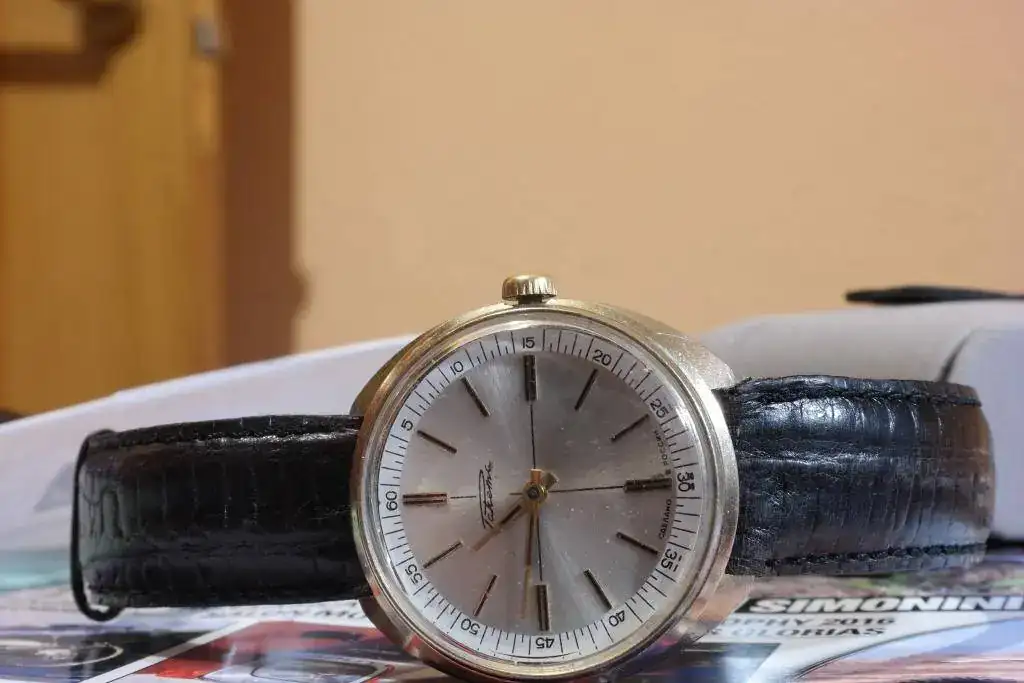 Que bonito es ese Raketa compi, muy elegante y atemporal como bien comentas.Hoy de Vestir . Raketa de caja dorada y esfera plateada con rueda de indices en blanco , indices en oro y negro y fijaos que diseño las agujas . Un reloj atemporal y con una precision mas que aceptable .: 30 segundos cada 24 horas . Lastima que no sea acuatico , pero no lo puede tener todo .Ver el archivos adjunto 424247