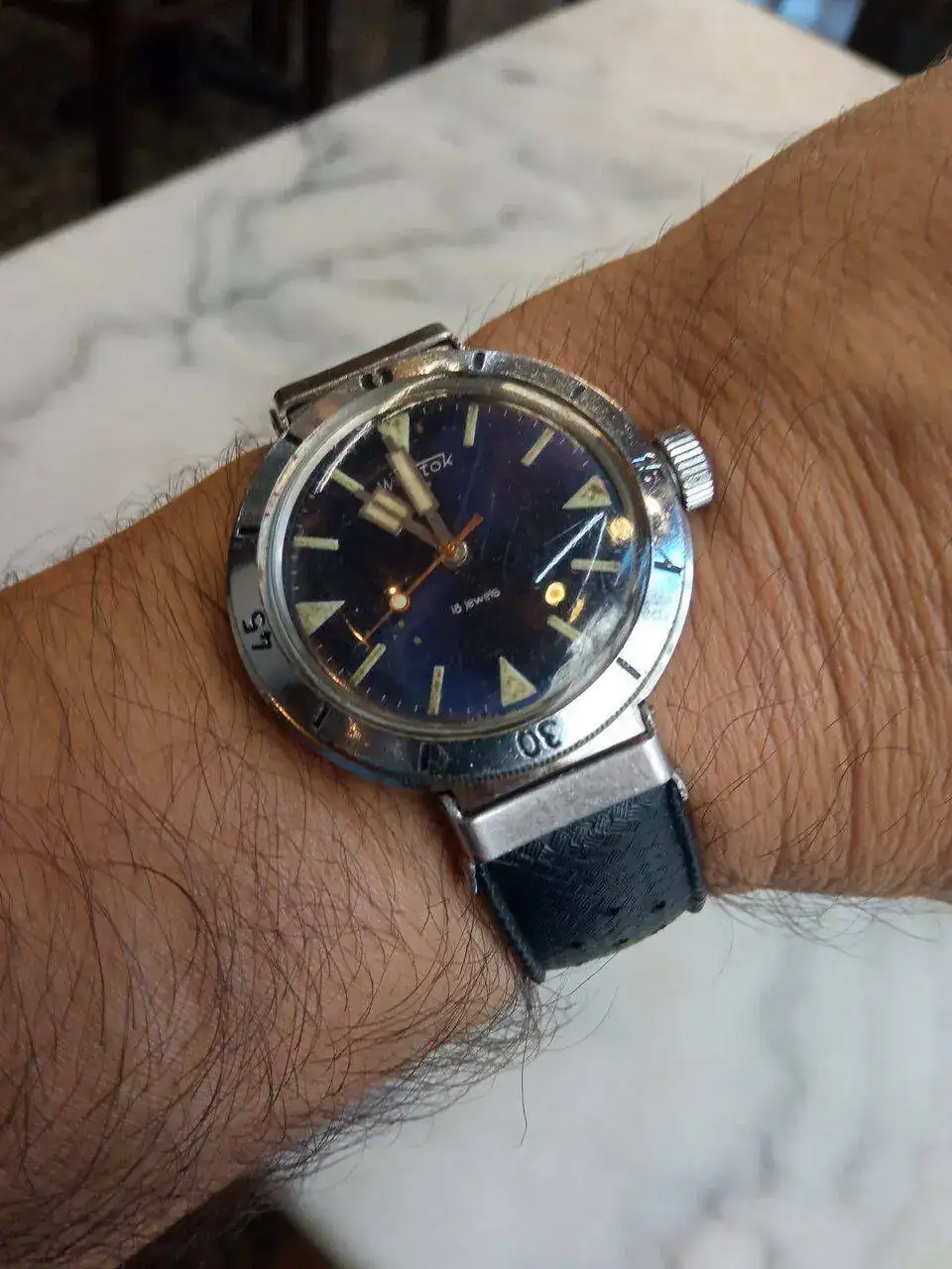 Gracias amigo! Si, creo que sus agujas no son las que llevaba en origen, pero así se quedará. Como curiosidad te diré que este reloj (y también un Citizen Speddy y un Favre-Leuba) lo pillé en una feria de numismática, que cosas. Un saludo!Bonito ejemplar pinon. Uno de los sovieticos mas buscados sin duda