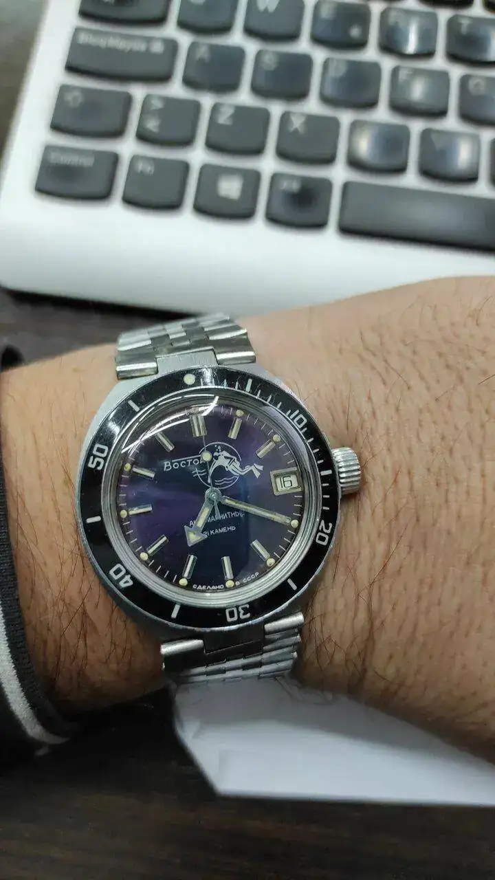 No es el que llevo puesto, ni es enteramente ruso, pero mi chica me ha pedido que le ponga este -movimiento nh35 sin segundero y esfera Vostok- en hora para llevárselo puesto.