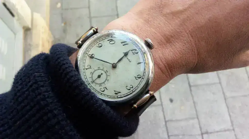 Efectivamente, es un "marriage" y la caja no es la típica "saucepan" con asas móviles, sino que conserva la caja del reloj de bolsillo. Mucho se especula sobre estos relojes, si fueron "marriage" de época, o lo hicieron en tiempos más modernos... hay teorías para todos los gustos; a mi lo que realmente más me importaba, era tener esa esfera con ese logo en la colección. La orientación, puede ser útil si estuviese a los mandos de algún carro de combate o de un avión y lo llevase en la cara interna de la muñeca...: