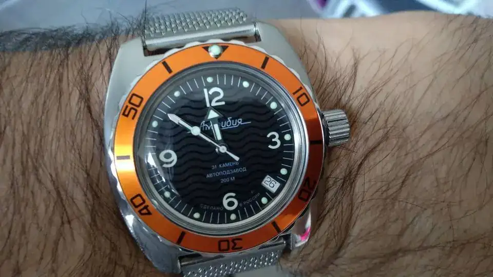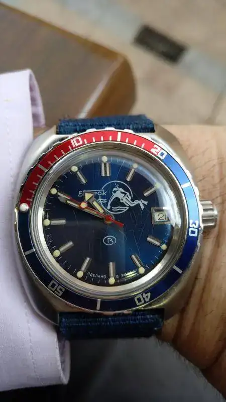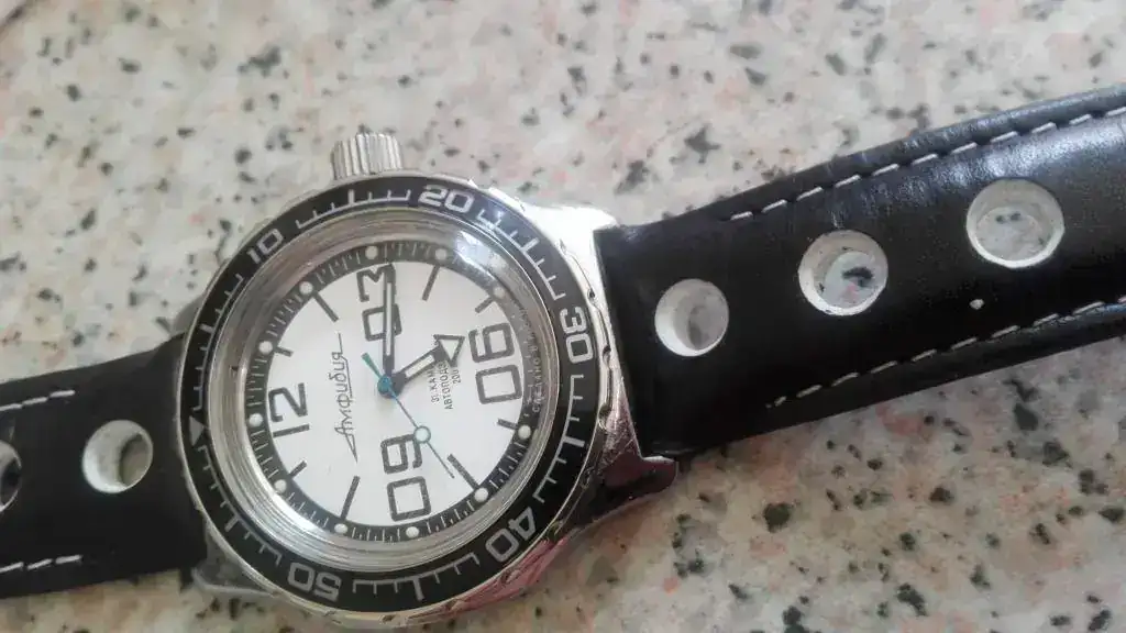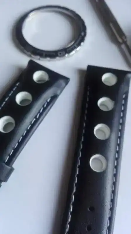 La última (por ahora) modificación al blanquito. Bisel de Meranom y correa de cousinsuk.com. Baratita, pero muy resultona. Las piezas para el mod: