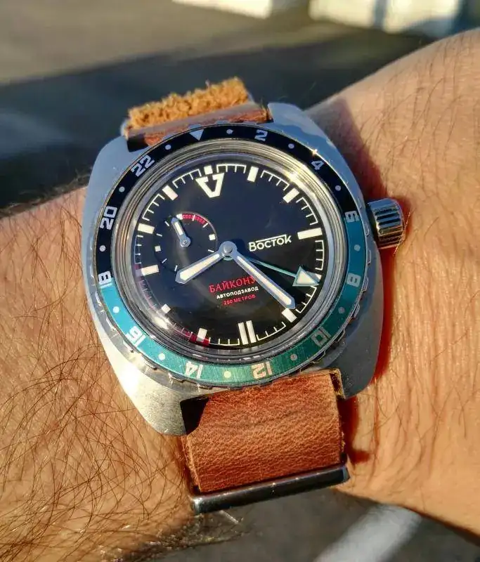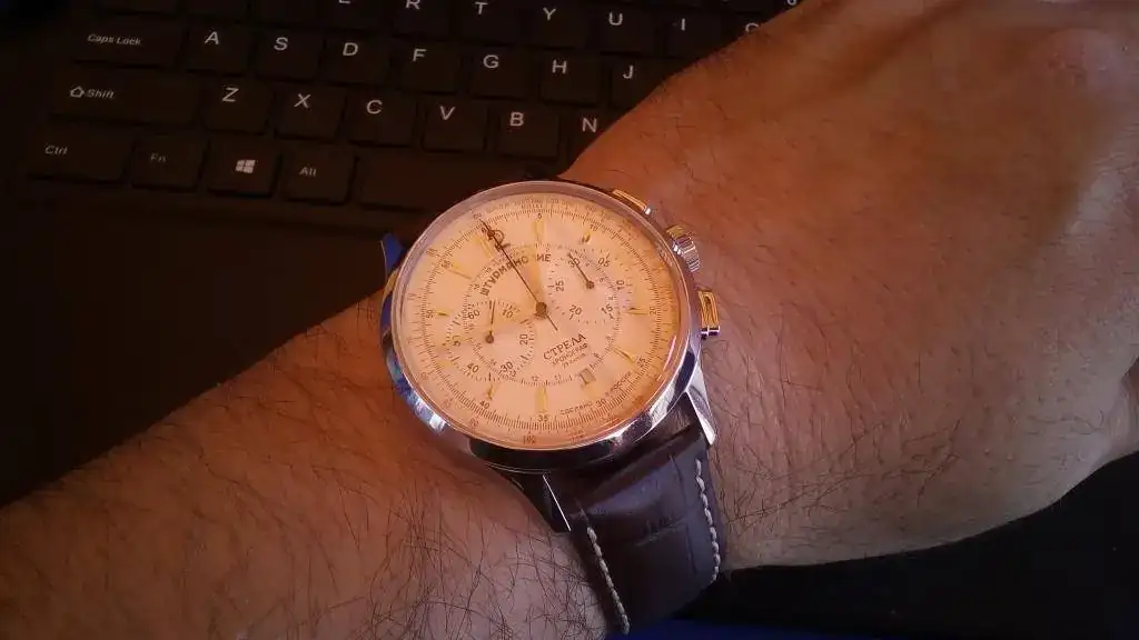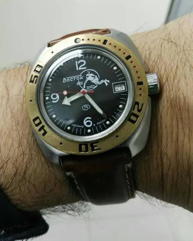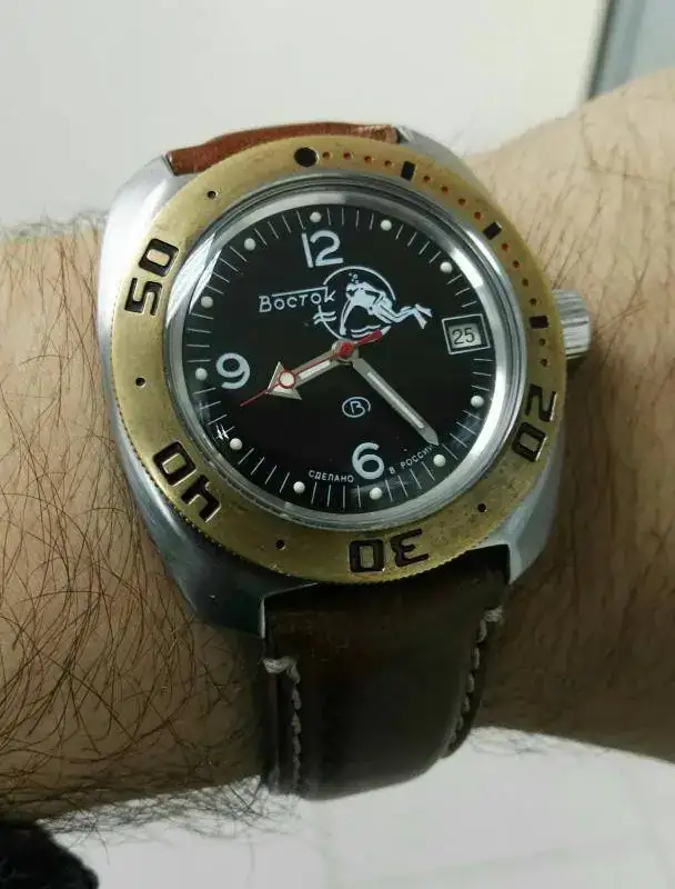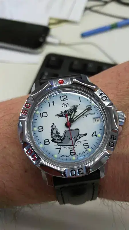 Pues yo estos días mi última adquisición, comprada en el típico perejod de la Avenida Nevsky. Un Vostok Komandirskie de remonte manual con un Mig-29 despegando desde la cubierta del "Almirante Kuznetsov".