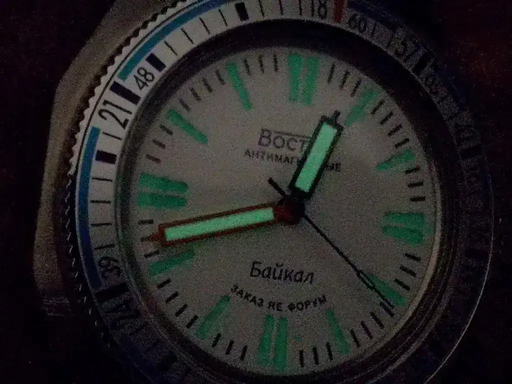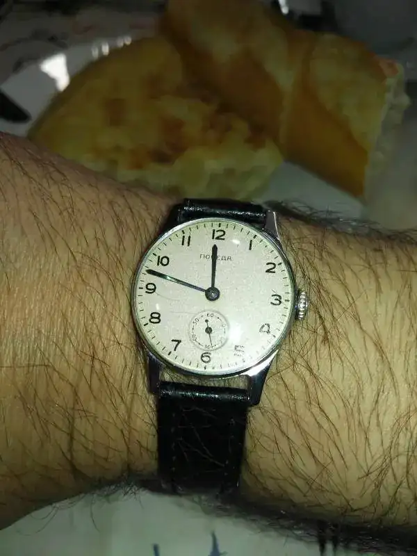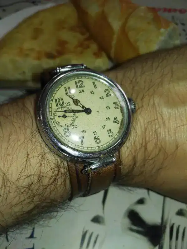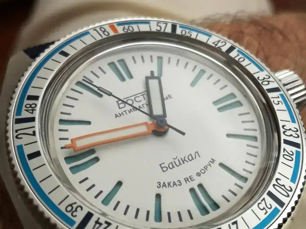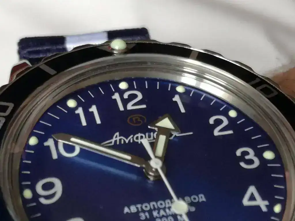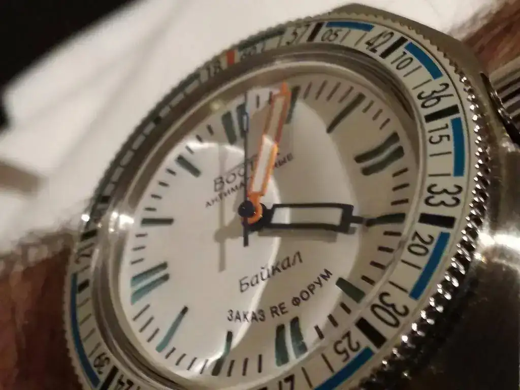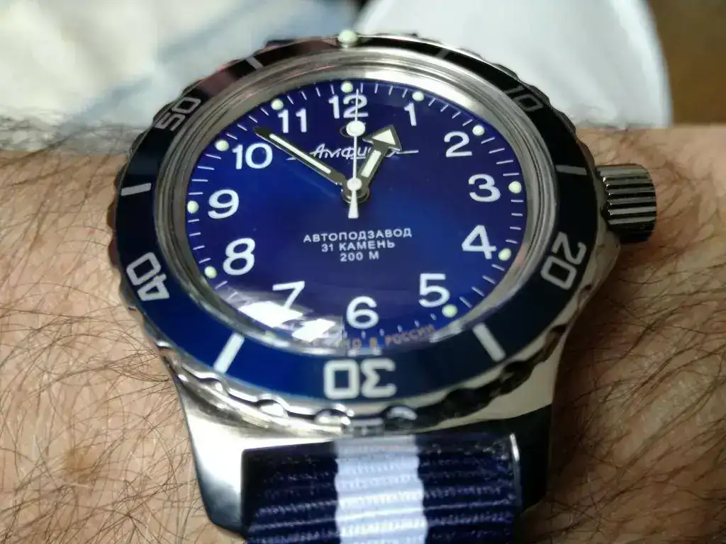 Hoy con un ruso pero que no parece ruso porque está "europeizado". Sin caracteres cirilicos, y lo mejor es que no tiene corona bailona y el bisel hace "click click"al girar.