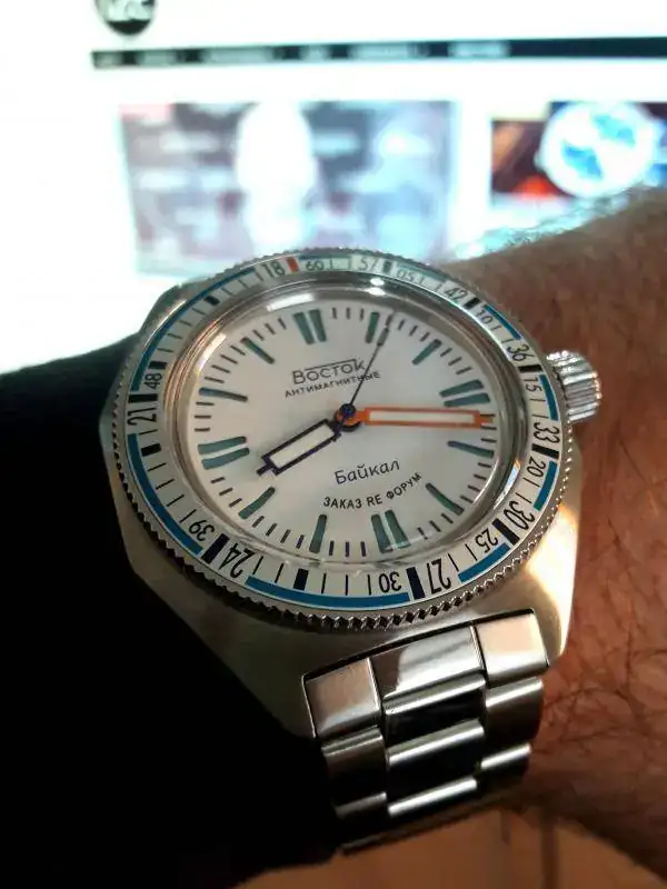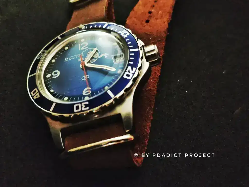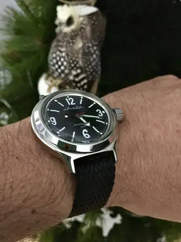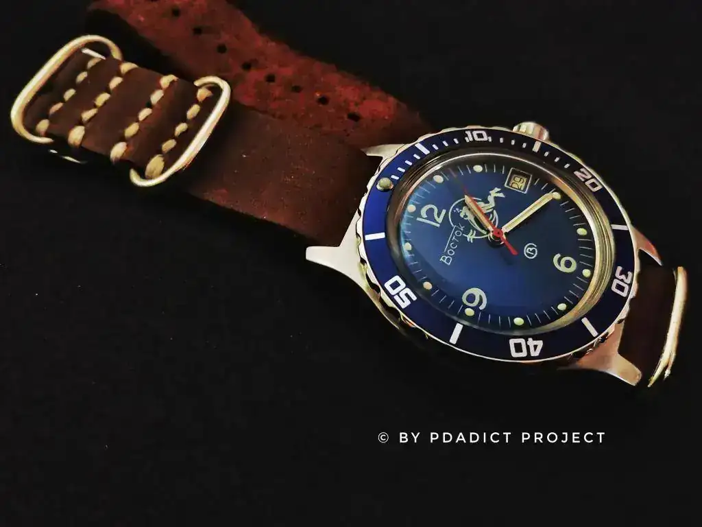 La correa te ha quedado muy bien. Parece un reloj de estética militar, fabricado en mi opinión tras la desaparición de la URSS, creo que el dial es un homenaje a la creación del Ejército Rojo de campesinos y obreros en 1918 (https://es.wikipedia.org/wiki/Ejército_Rojo). Puede ser interesante el movimiento interno, no sé, podría ser un 3602....