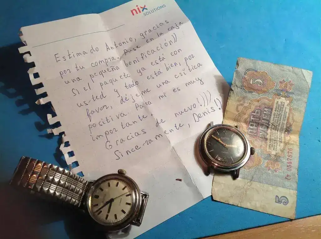 Proviene de Ucrania, de un majo vendedor, que junto a los dos relojes, me mandó 5 rublos del 61 y una carta manuscrita en español. Anda que si tuviera que escribir yo en cirilico.