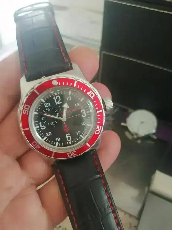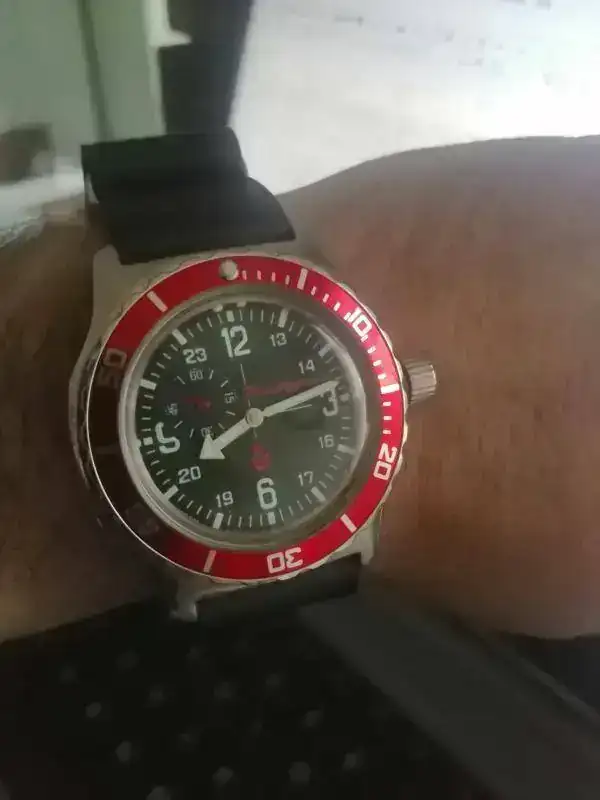 Pues hoy llevamos este. También llevaba mucho sin salir porque tenía roto el plexi, y quedaba feote. Ayer me acordé de que tenía un Amphibia muerto, e hice un intercambio de cajas. De paso le cambié el look con este bisel rojo que tenía por ahí y una nato de piel negra. Ya le buscaré otra que me guste más.