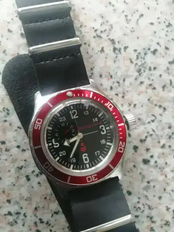 Pues no veo que le quede nada mal esa nato negra al reloj, nada malPues hoy llevamos este. También llevaba mucho sin salir porque tenía roto el plexi, y quedaba feote. Ayer me acordé de que tenía un Amphibia muerto, e hice un intercambio de cajas. De paso le cambié el look con este bisel rojo que tenía por ahí y una nato de piel negra. Ya le buscaré otra que me guste más.