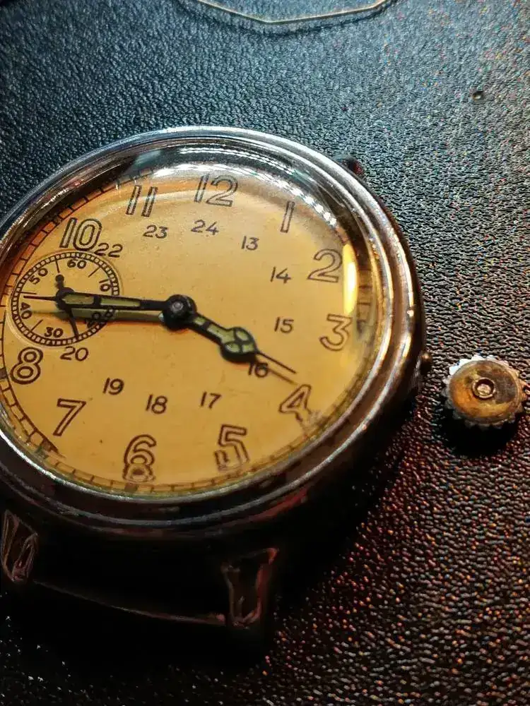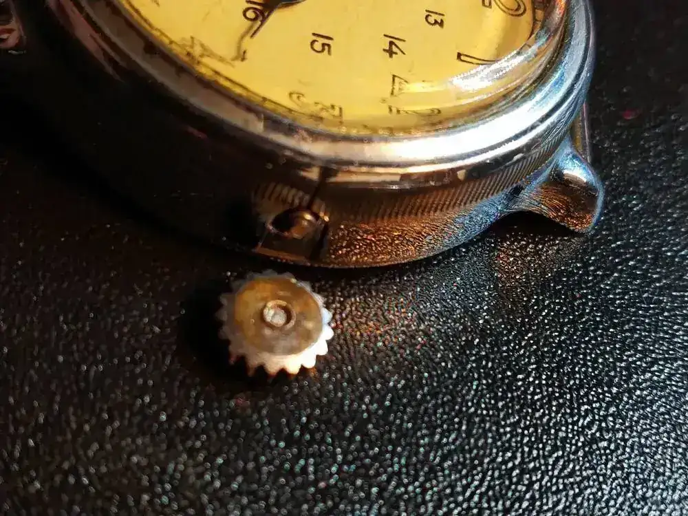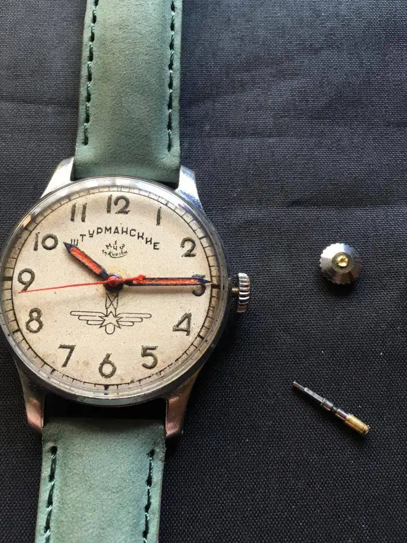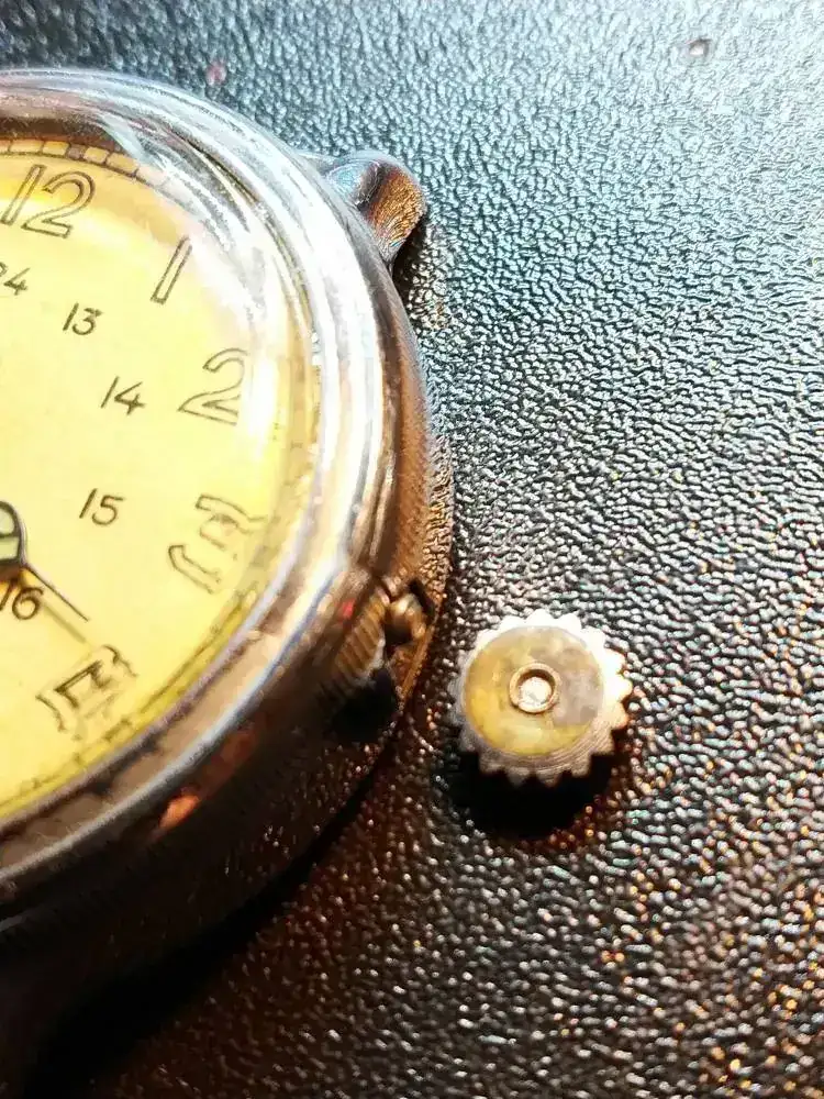 El gato lo tiró al suelo, jugando con él, 85 cm de altura. Como es soviético el eje de volante sobrevivió y lo único que ocurrió es que partió la tija. En la foto tiene una tija de Pobeda que es casi el mismo movimiento y funciona. Estoy esperando un conjunto original tija-corona. Esa cuando pueda la soldaré para tener un repuesto.