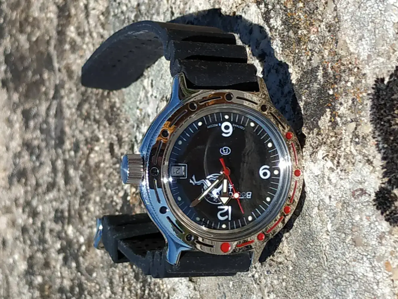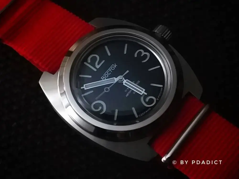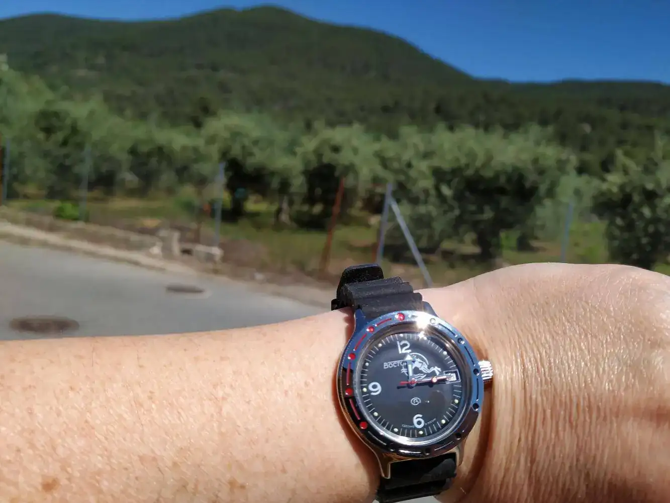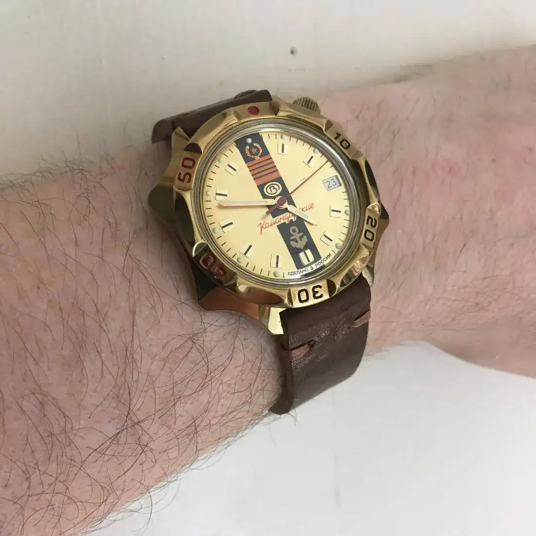He comprobado el excelente ajuste de mi nuevo Komandirskie (entre -3 y +5 s/día de desvío según la posición) y eso significa que lo voy a usar. ¿Os parece que la correa marrón le sienta bien? ¿Le quita un poco el aspecto “patrón del mal”?