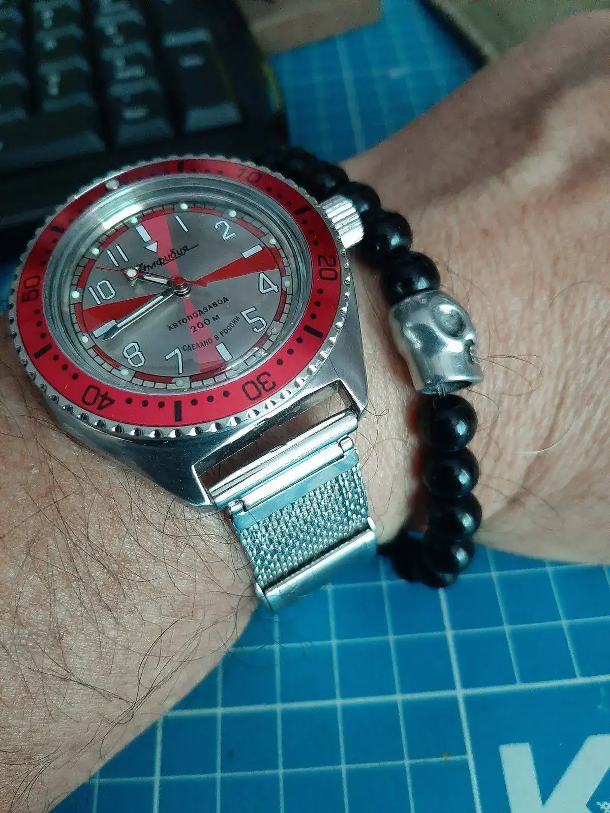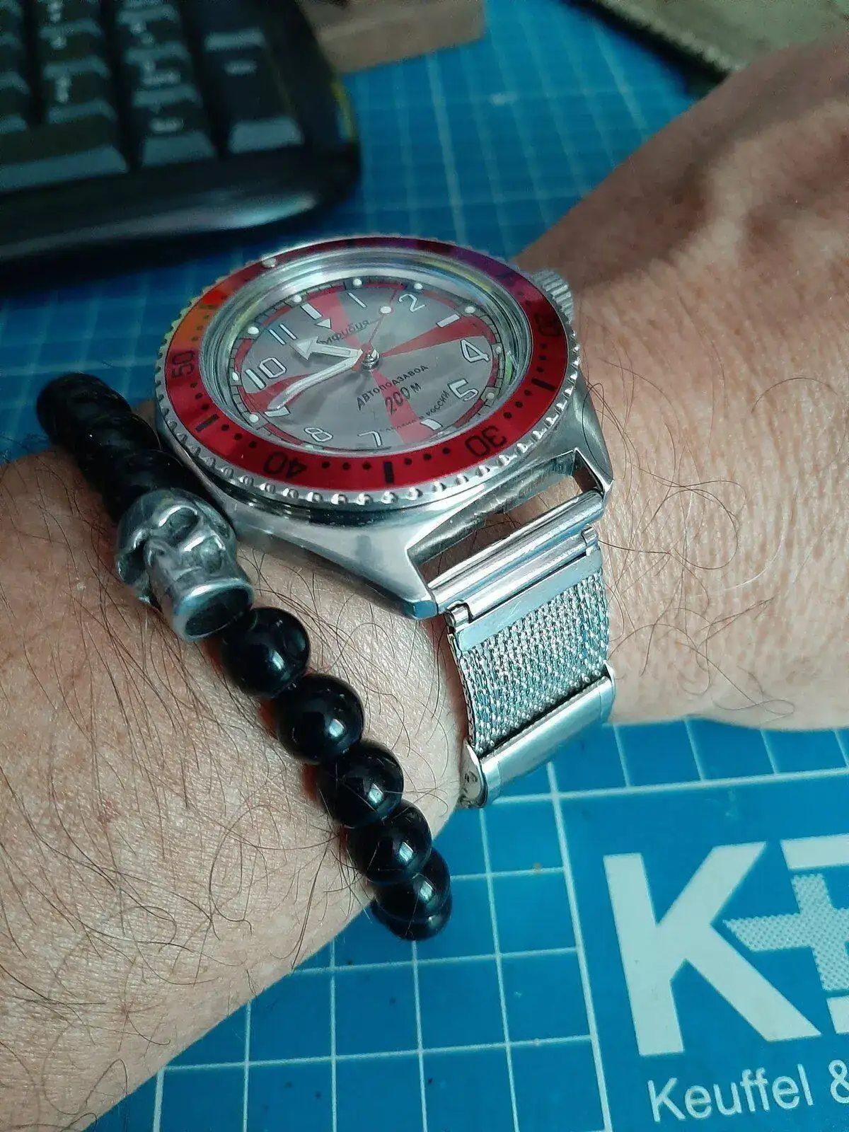 Buen dia colegas, yo continuo "rodando" el RRO, (pues cuando lo recibi, tuve que darle varias "collejas" para que "despertara" y quiero probarlo, hasta el momento, ya mas de una semana y ningun problema), ayer mientras estaba "jugando" con los biseles que tengo, decidi probarle este un bisel de un color rojo "raro" que compre en Komandyrskie, casi lo tenia por descartado con mis otros rusos, pero con esete RRO, me gusto la mezcla de rojos, y creo que de momento se lo dejaré para el verano.