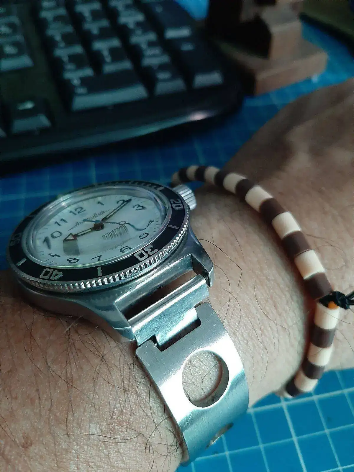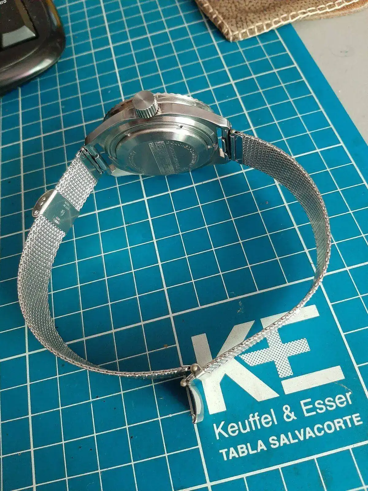 Tambien le puse un brazalete ajustable que "pesqué" con mi relojero , es de un tejido tipo malla milanesa, muy finito, pero es ajustable a muñecas tamaño Hulk,