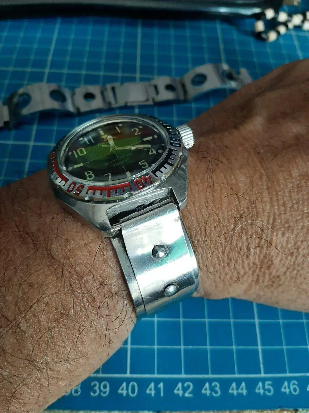 No compañero, ya quisiera yo tener las manitas para hacer brazaletes, pero por desgracia no es mi campo de experticia, el brazalete me lo consiguio un buen amigo, que se dedica a visitar bazares y mercados de pulgas por pasatiempo y hace tiempo le di la encomienda de que me consiguiera brazaletes para relojes vintages. Cuando me llamo esta mañana, me dijo, "tengo un brazalete, creo que es para reloj" y me mando algunas fotos, y media hora despues estaba recogiendolo, no me lo quiso cobrar, asi que le invite unas cervecitas, que el calor este dia esta mas "iracundo" que lo normal.Ostias! Lo has hecho tú? De joven fui aprendiz en unos talleres donde me hice algunos brazaletes parecidos.