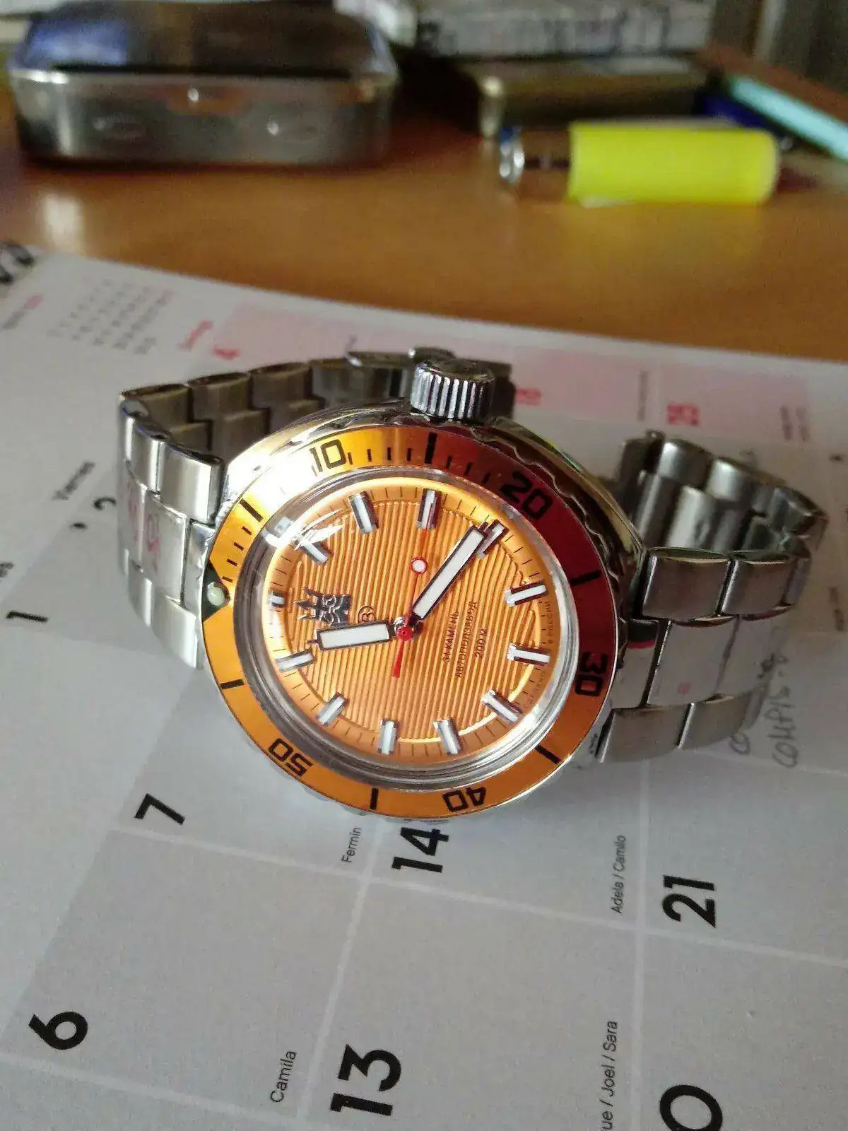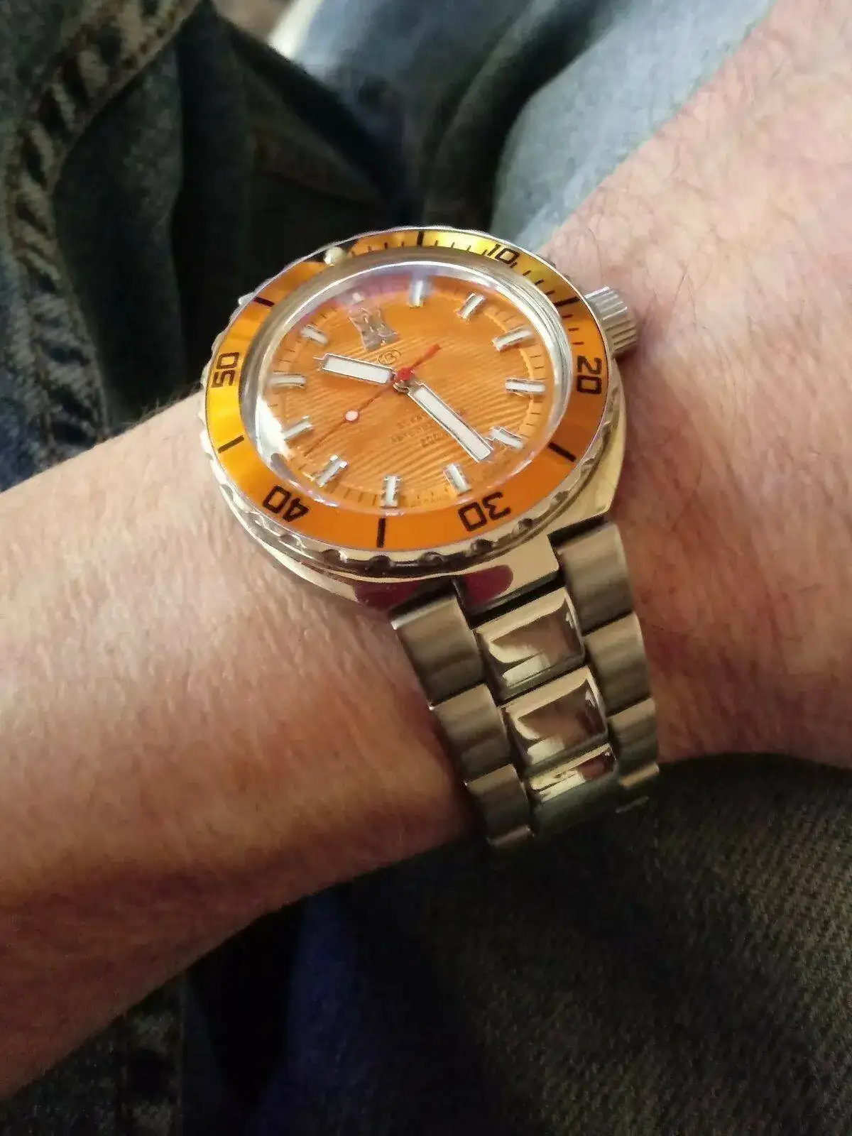 Es un dial sobrio, formal, elegante... Y con ese bisel gana empaque. La verdad es que queda muy bien. Estos rusos son muy agradecidos.A mi no me gustan los armis (nada!), pero es cierto, al reloj le queda muy bien... Y el dial es de los mas bonitos de Vostok, para mi gusto, que con ese bisel, pues... mejor!