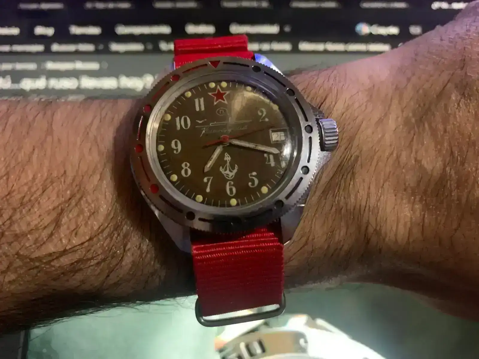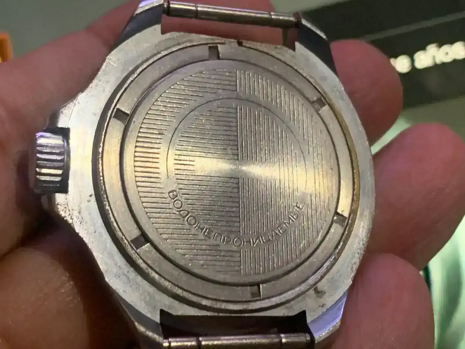 Como bien dices es un Vostok Komandirskie con movimiento 2414A de cuerda manual. La esfera originalmente era negra, no sé si es la foto o que el color se ha degradado. Es un reloj fabricado en los 80 con caja de latón cromado y de origen tiene una resistencia al agua de 100 metros. Esta resistencia por supuesto ya no está garantizada salvo que alguien le haya hecho el servicio correspondiente y haya comprobado el hermetismo del reloj.Este que rescaté del rastro el sábado y no sé muy bien lo que es 🤦🏻♂️. Creo que es un Komandirskie, con movimiento 2414A manual. Mis dudas son de qué año debe ser, el material de la caja y la resistencia al agua.
